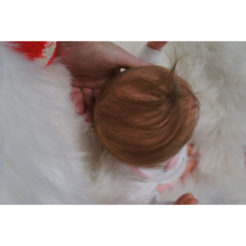 Meine Haare sind mittelblond und im micro Rooting Verfahren einzeln eingepflanzt (Feinstes Alpakamohair ). Anschließend natürlich von innen versiegelt. Und nun kann man meine Haare kämmen und auch mal leicht waschen. Die passenden Wimpern habe ich auch dazu gerootet bekommen, das sieht jetzt richtig echt aus. Meine Finger- und Fußnägel wurden fein Pedi- und Manikürt und anschließend dauerhaft versiegelt. Zum Schluss bekam ich noch einen Magnetschnuller. Und ein Duftöl aufgetragen, jetzt riech ich auch noch wie ein echtes Baby.