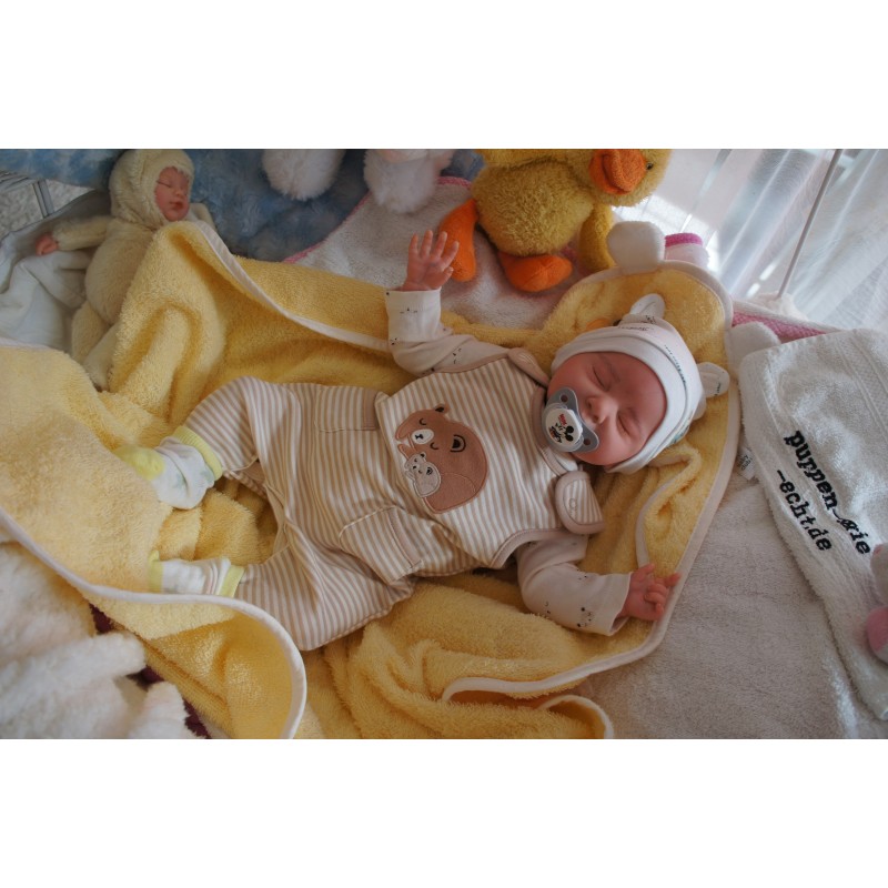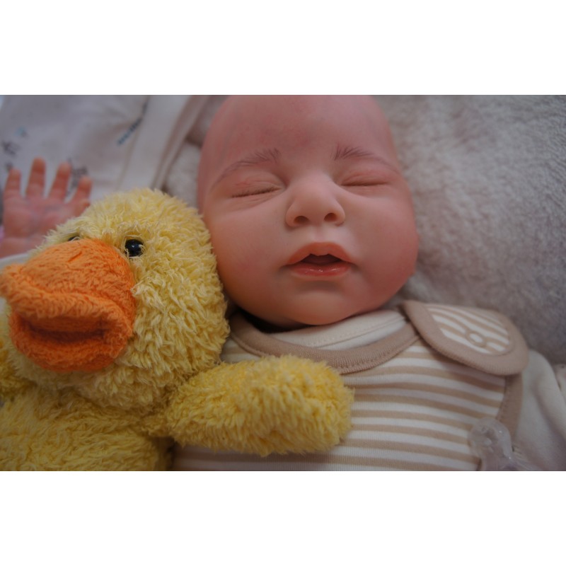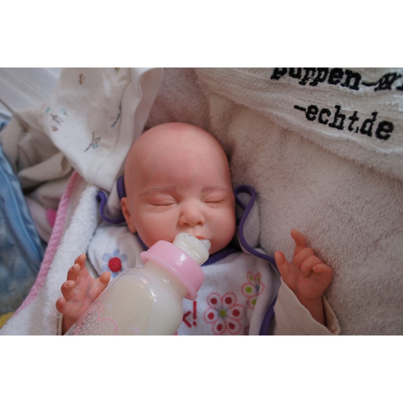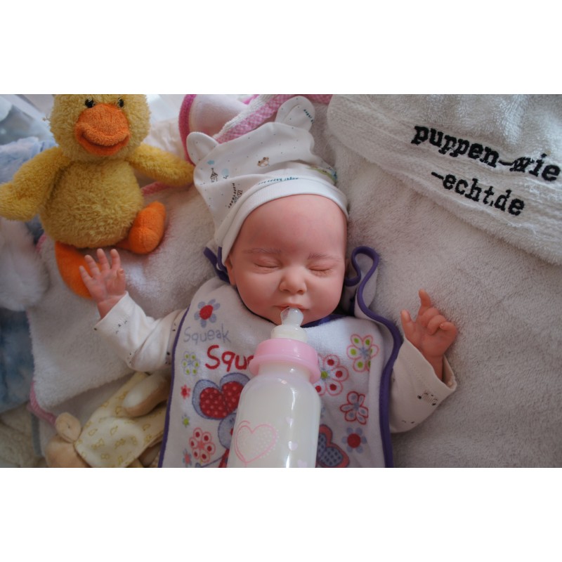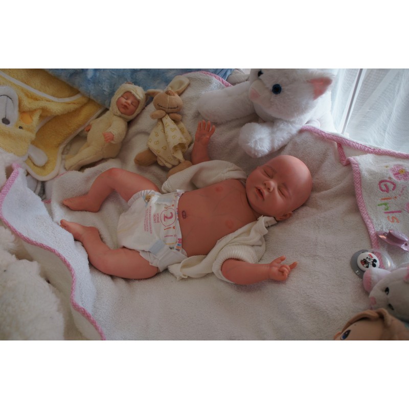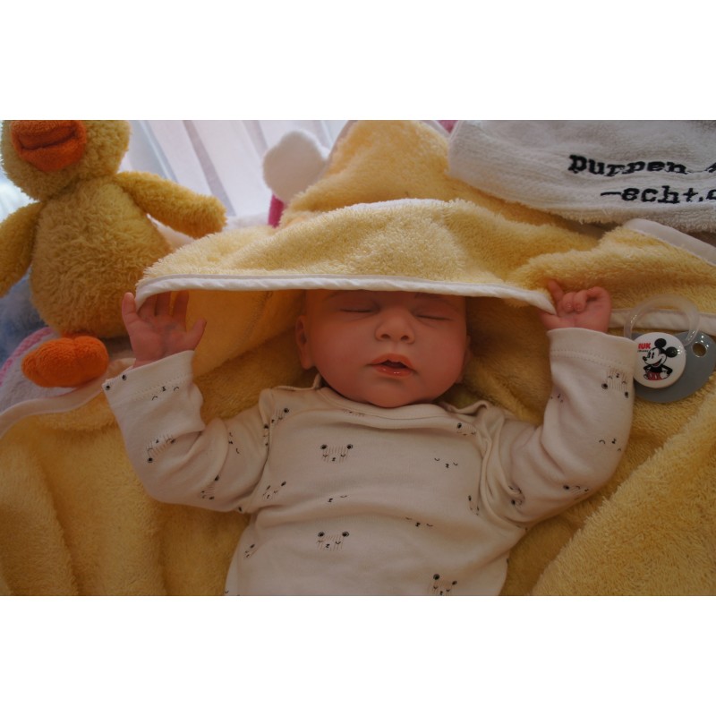 Ich wurde mit hochwertigen Farben in Real Effekt Technik eingefärbt. Mit Genesis Farben habe ich dieses alles noch mal zum Schluss gut versiegelt und eingebrannt. Diese wurde in mehreren Schichten aufgetragen, sodass ein sehr realistisches Hautbild entstanden ist. (Wisch- und Wasserfest kein Abblättern mgl). Feinste Schattierungen und leichte Betonung der Speckfalten wurden bei mir auch nicht vergessen. Leichte Äderchen an Händen, Armen, Füßchen, Beinen, Ohren, Kopf und Gesicht lassen mich wie ein echtes Baby aussehen. Jedes Fältchen an mir wurde einzeln betont. Zarte Augenbrauen wurden mir auch gegeben. Meine Nase wurde geöffnet und hinterlegt, sodass ich jetzt auch gut Luft bekomme. Auch zarte Befeuchtung der Augen, Mund und Nase lassen mich noch echter wirken.