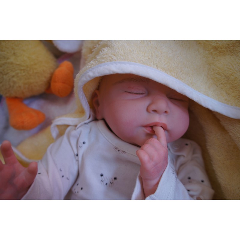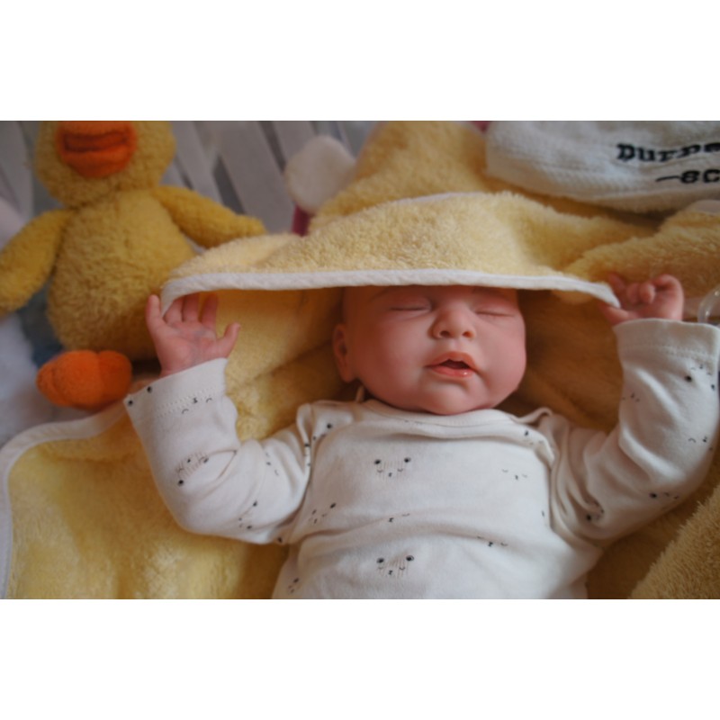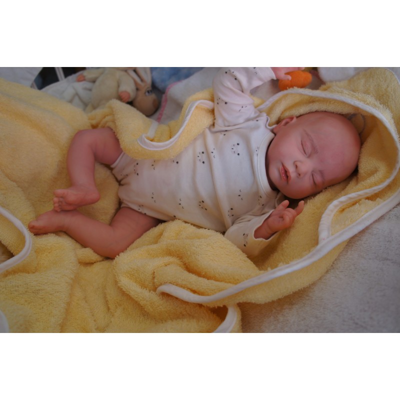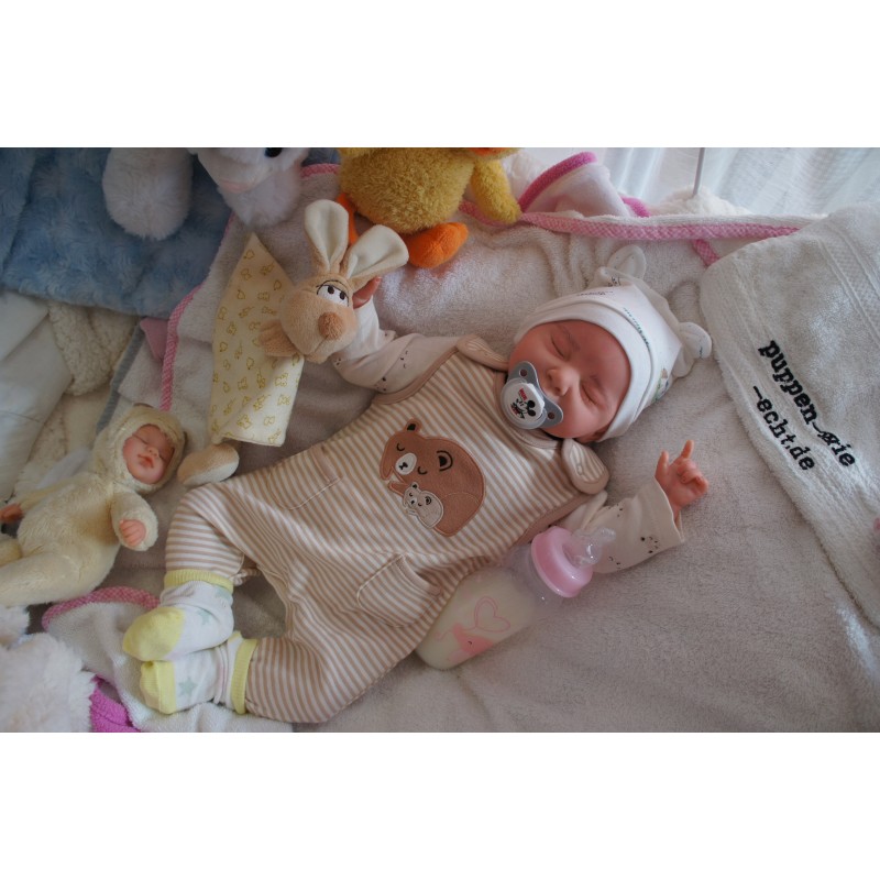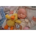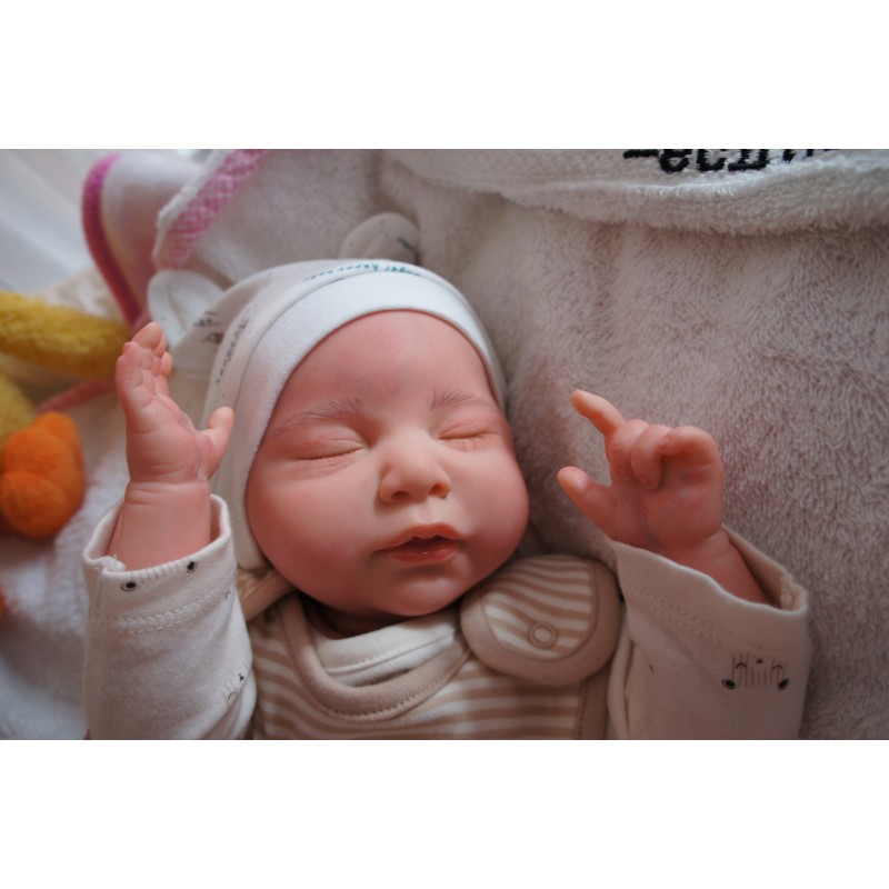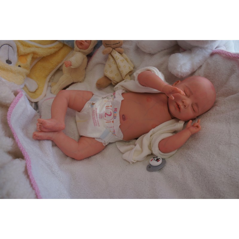 Ich wurde mit hochwertigen Farben in Real Effekt Technik eingefärbt. Mit Genesis Farben habe ich dieses alles noch mal zum Schluss gut versiegelt und eingebrannt. Diese wurde in mehreren Schichten aufgetragen, sodass ein sehr realistisches Hautbild entstanden ist. (Wisch- und Wasserfest kein Abblättern mgl). Feinste Schattierungen und leichte Betonung der Speckfalten wurden bei mir auch nicht vergessen. Leichte Äderchen an Händen, Armen, Füßchen, Beinen, Ohren, Kopf und Gesicht lassen mich wie ein echtes Baby aussehen. Jedes Fältchen an mir wurde einzeln betont. Zarte Augenbrauen wurden mir auch gegeben. Meine Nase wurde geöffnet und hinterlegt, sodass ich jetzt auch gut Luft bekomme. Auch zarte Befeuchtung der Augen, Mund und Nase lassen mich noch echter wirken.