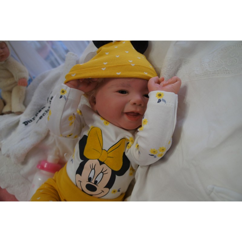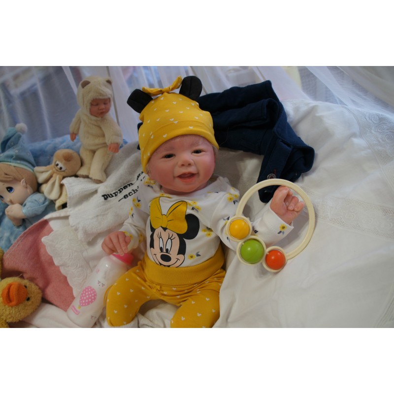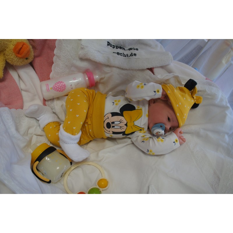 Ich wurde mit hochwertigen Farben in Real Effekt Technik eingefärbt. Mit Genesis Farben habe ich dieses alles noch mal zum Schluss gut versiegelt und eingebrannt. Diese wurde in mehreren Schichten aufgetragen, sodass ein sehr realistisches Hautbild entstanden ist. (Wisch- und Wasserfest kein Abblättern mgl). Feinste Schattierungen und leichte Betonung der Speckfalten wurden bei mir auch nicht vergessen. Leichte Äderchen an Händen, Armen, Füßchen, Beinen, Ohren, Kopf und Gesicht lassen mich wie ein echtes Baby aussehen. Jedes Fältchen an mir wurde einzeln betont. Zarte Augenbrauen wurden mir auch gegeben. Meine Nase wurde geöffnet und hinterlegt, sodass ich jetzt auch gut Luft bekomme. Auch zarte Befeuchtung der Augen, Mund und Nase lassen mich noch echter wirken.