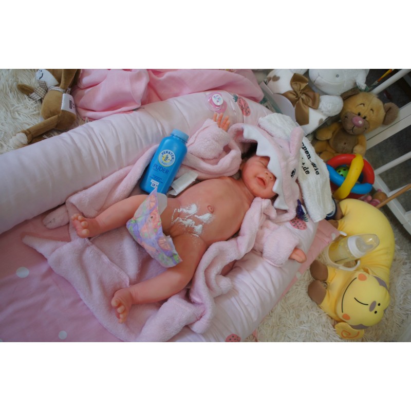 Ich wurde mit hochwertigen Farben eingefärbt und mit SAM Silikonpuder wurde ich am schluss noch mattiert. Die Farben wurden in mehreren Schichten aufgetragen, sodass ein sehr realistisches Hautbild entstanden ist. (Wisch- und Wasserfest kein Abblättern mgl). Feinste Schattierungen und leichte Betonung der Speckfalten wurden bei mir auch nicht vergessen. Leichte Äderchen an Händen, Armen, Füßchen, Beinen, Ohren, Kopf und Gesicht lassen mich wie ein echtes Baby aussehen. Jedes Fältchen an mir wurde einzeln betont. Zarte Augenbrauen wurden mir auch gegeben. Auch zarte Befeuchtung der Augen, Mund und Nase lassen mich noch echter wirken (Mit Fuse FX Silikonfarben).