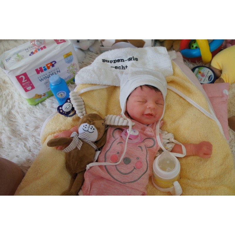 Ich habe auch das richtige Gewicht wie ein echtes Baby und liege auch so in Deinen Armen!!! Ich rieche auch wundervoll nach Baby.