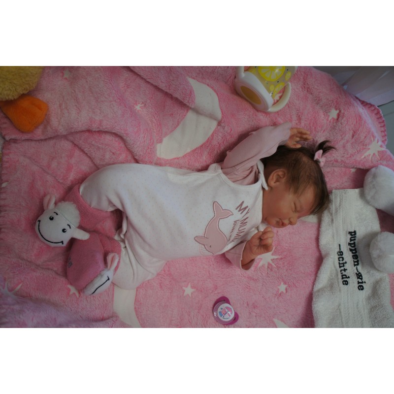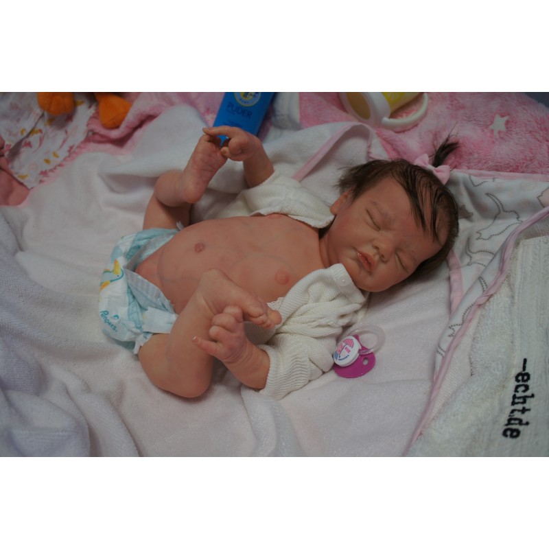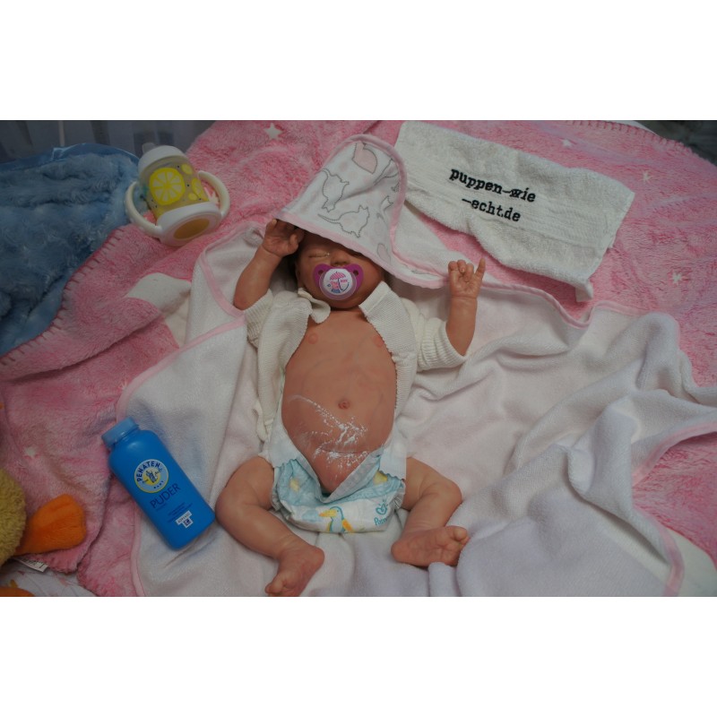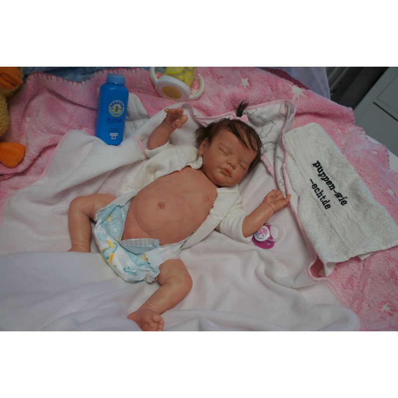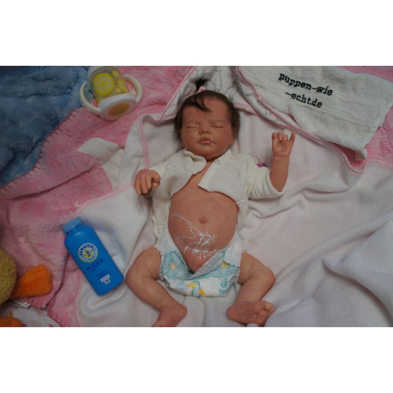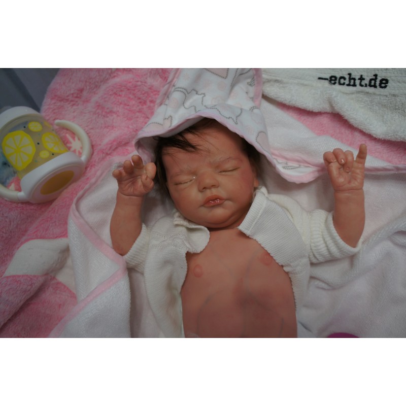 Ich wurde mit hochwertigen Farben in Real Effekt Technik eingefärbt. Mit Genesis Farben habe ich dieses alles noch mal zum Schluss gut versiegelt und eingebrannt. Diese wurde in mehreren Schichten aufgetragen, sodass ein sehr realistisches Hautbild entstanden ist. (Wisch- und Wasserfest kein Abblättern mgl). Feinste Schattierungen und leichte Betonung der Speckfalten wurden bei mir auch nicht vergessen. Leichte Äderchen an Händen, Armen, Füßchen, Beinen, Ohren, Kopf und Gesicht lassen mich wie ein echtes Baby aussehen. Jedes Fältchen an mir wurde einzeln betont. Zarte Augenbrauen wurden mir auch gegeben. Meine Nase wurde geöffnet und hinterlegt, sodass ich jetzt auch gut Luft bekomme. Auch zarte Befeuchtung der Augen, Mund und Nase lassen mich noch echter wirken.