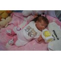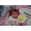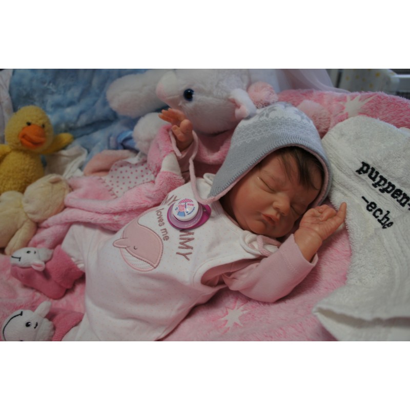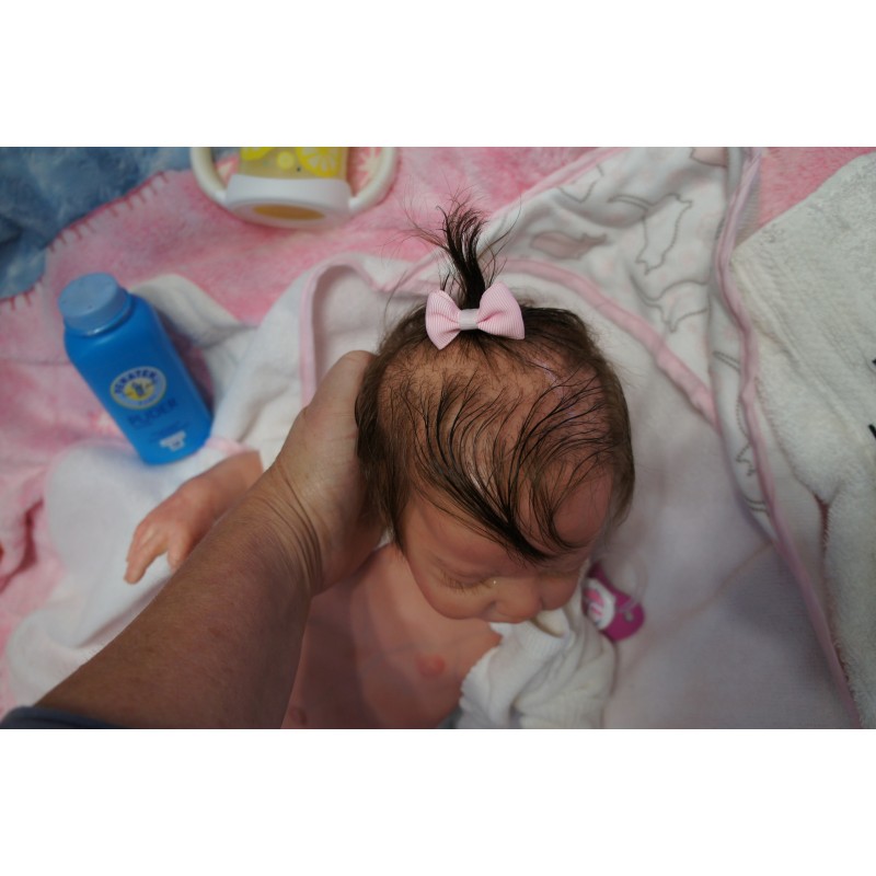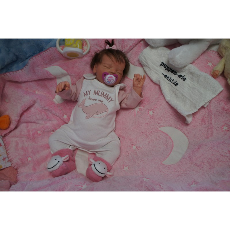 Meine Haare sind Schokobraun und im micro Rooting Verfahren einzeln eingepflanzt (Feinstes Mohair, Babyfluff Mohair). Anschließend natürlich von innen versiegelt. Und nun kann man meine Haare kämmen und auch mal leicht waschen. Die passenden Wimpern habe ich auch dazu gerootet bekommen, das sieht jetzt richtig echt aus. Meine Finger- und Fußnägel wurden fein Pedi- und Manikürt und anschließend dauerhaft versiegelt. Zum Schluss bekam ich noch einen Magnetschnuller. Und ein Duftöl aufgetragen, jetzt riech ich auch noch wie ein echtes Baby.
