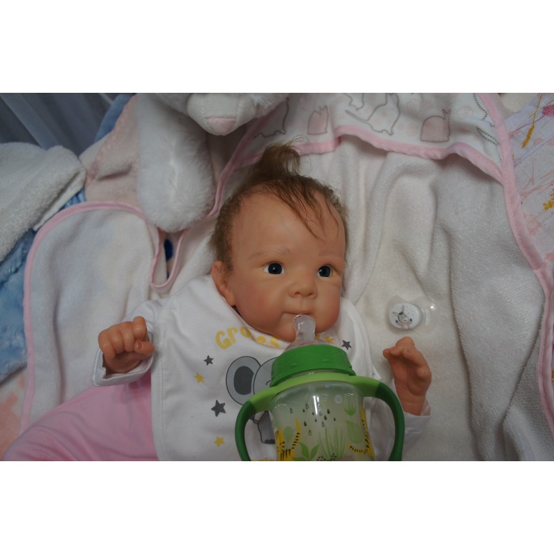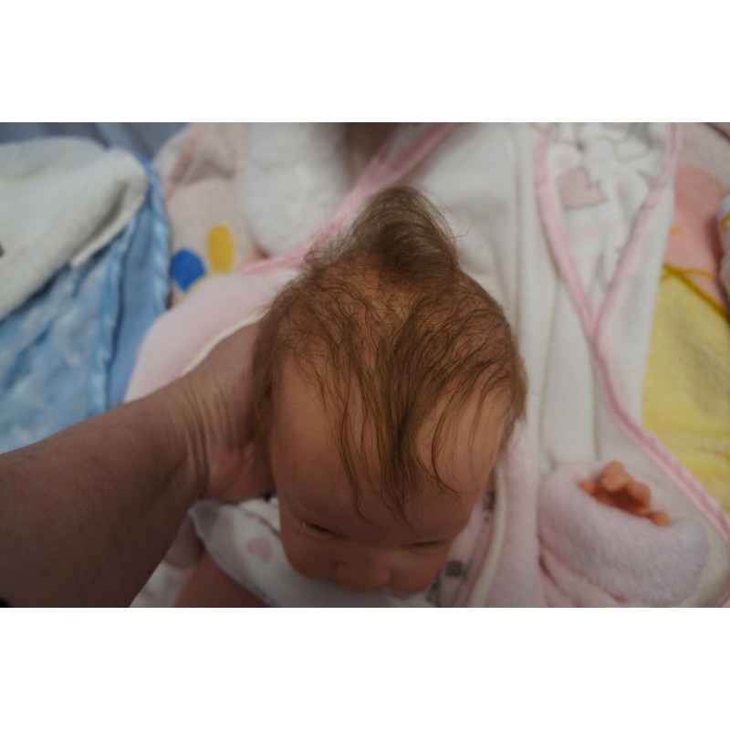 Meine Haare sind mittelbraun und im micro Rooting Verfahren einzeln eingepflanzt (Feinstes Babyfluff Mohair). Anschließend natürlich von innen versiegelt. Und nun kann man meine Haare kämmen und auch mal leicht waschen. Die passenden Wimpern habe ich auch dazu gerootet bekommen, das sieht jetzt richtig echt aus. Meine Finger- und Fußnägel wurden fein Pedi- und Manikürt und anschließend dauerhaft versiegelt. Zum Schluss bekam ich noch einen Magnetschnuller. Und ein Duftöl aufgetragen, jetzt riech ich auch noch wie ein echtes Baby.