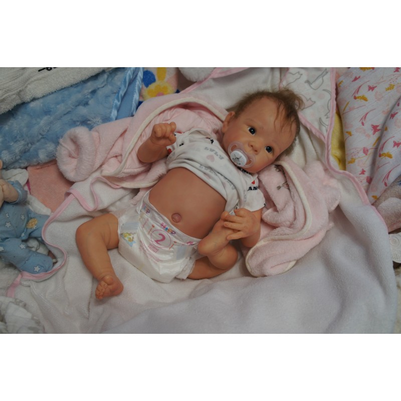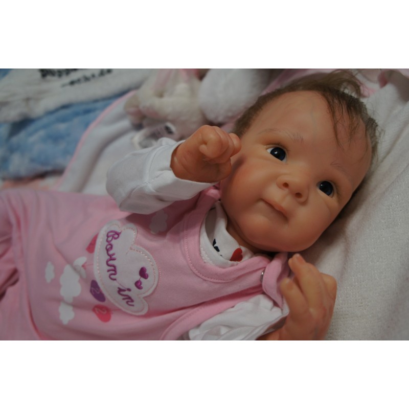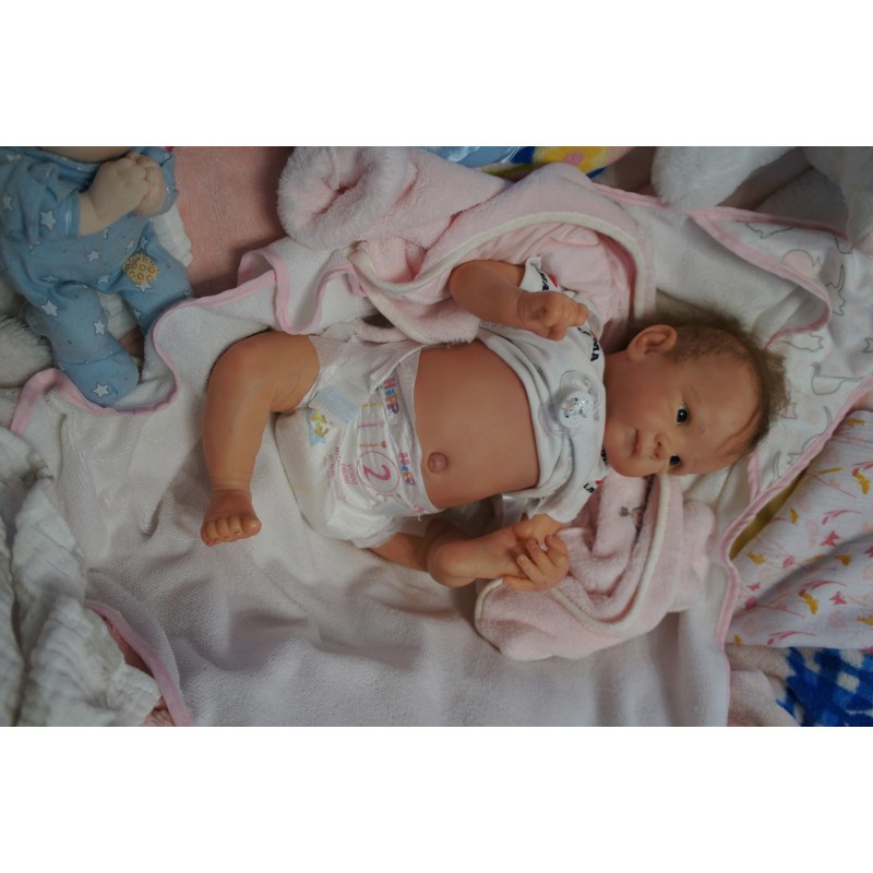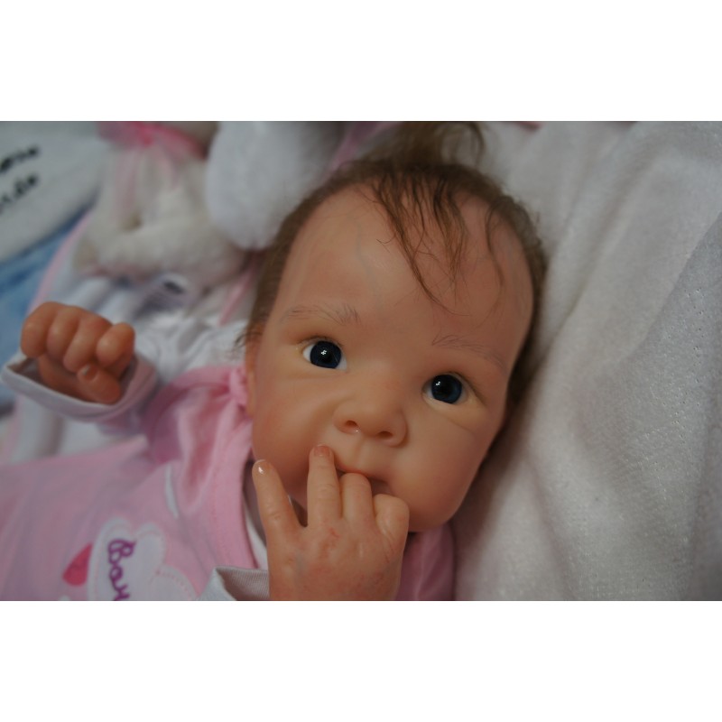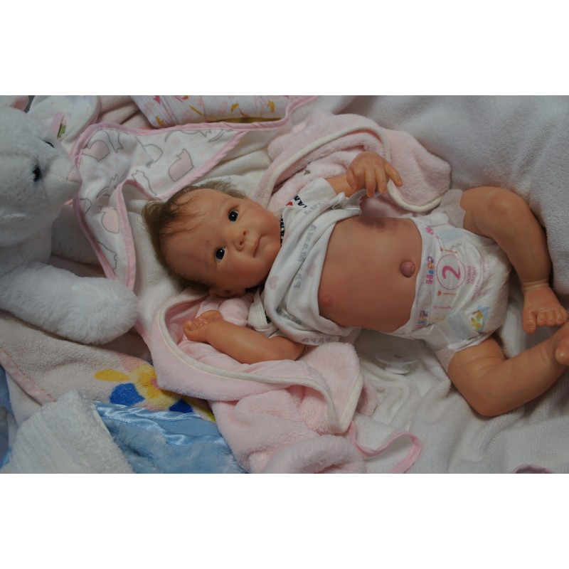 Ich wurde mit hochwertigen Farben in Real Effekt Technik eingefärbt. Mit Genesis Farben habe ich dieses alles noch mal zum Schluss gut versiegelt und eingebrannt. Diese wurde in mehreren Schichten aufgetragen, sodass ein sehr realistisches Hautbild entstanden ist. (Wisch- und Wasserfest kein Abblättern mgl). Feinste Schattierungen und leichte Betonung der Speckfalten wurden bei mir auch nicht vergessen. Leichte Äderchen an Händen, Armen, Füßchen, Beinen, Ohren, Kopf und Gesicht lassen mich wie ein echtes Baby aussehen. Jedes Fältchen an mir wurde einzeln betont. Zarte Augenbrauen wurden mir auch gegeben. Meine Nase wurde geöffnet und hinterlegt, sodass ich jetzt auch gut Luft bekomme. Auch zarte Befeuchtung der Augen, Mund und Nase lassen mich noch echter wirken.
