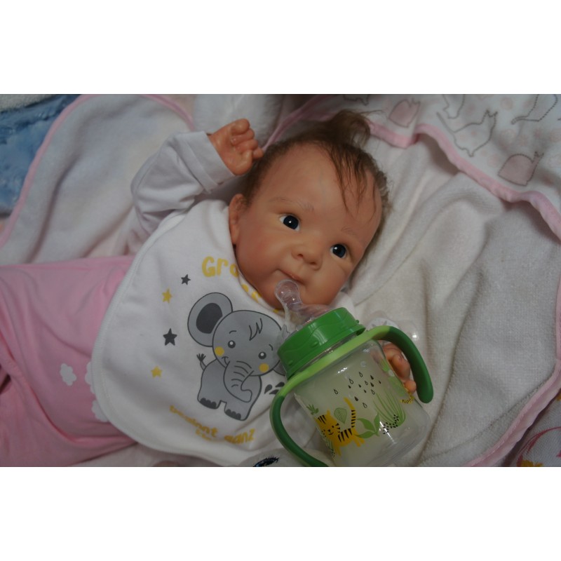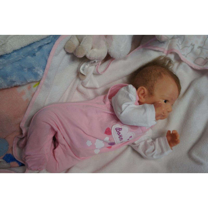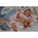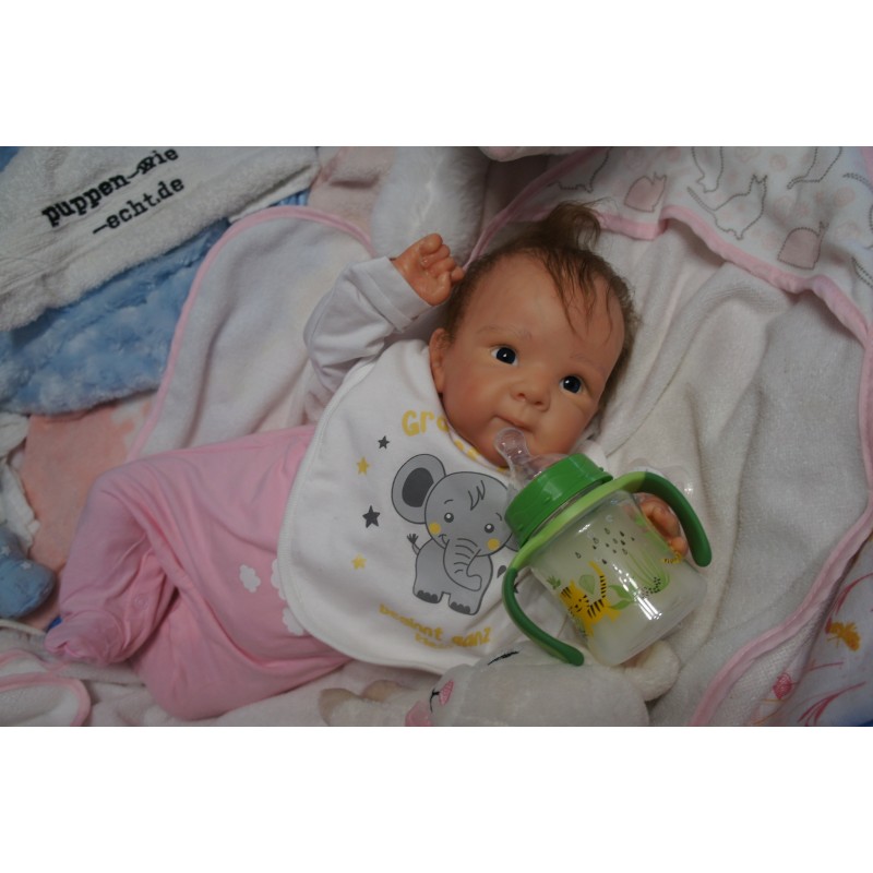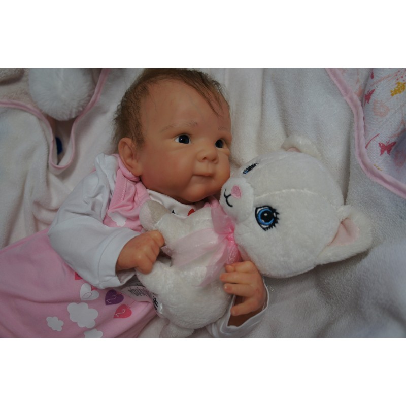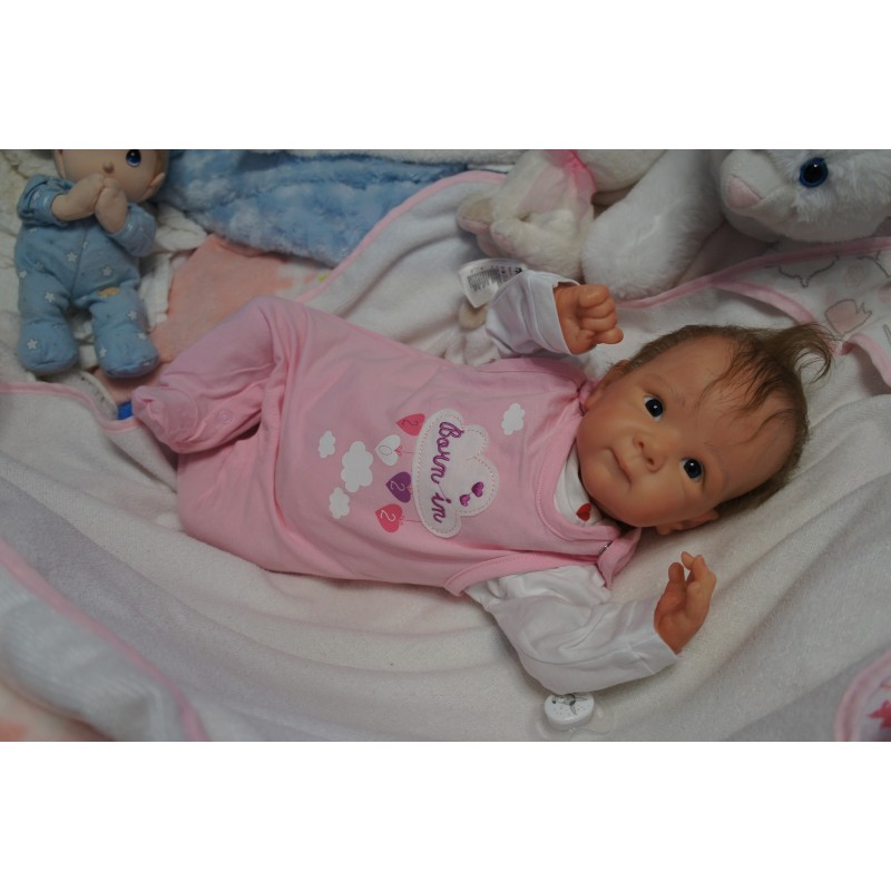 Ich wurde mit hochwertigen Farben in Real Effekt Technik eingefärbt. Mit Genesis Farben habe ich dieses alles noch mal zum Schluss gut versiegelt und eingebrannt. Diese wurde in mehreren Schichten aufgetragen, sodass ein sehr realistisches Hautbild entstanden ist. (Wisch- und Wasserfest kein Abblättern mgl). Feinste Schattierungen und leichte Betonung der Speckfalten wurden bei mir auch nicht vergessen. Leichte Äderchen an Händen, Armen, Füßchen, Beinen, Ohren, Kopf und Gesicht lassen mich wie ein echtes Baby aussehen. Jedes Fältchen an mir wurde einzeln betont. Zarte Augenbrauen wurden mir auch gegeben. Meine Nase wurde geöffnet und hinterlegt, sodass ich jetzt auch gut Luft bekomme. Auch zarte Befeuchtung der Augen, Mund und Nase lassen mich noch echter wirken.