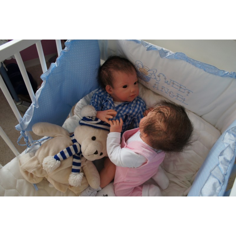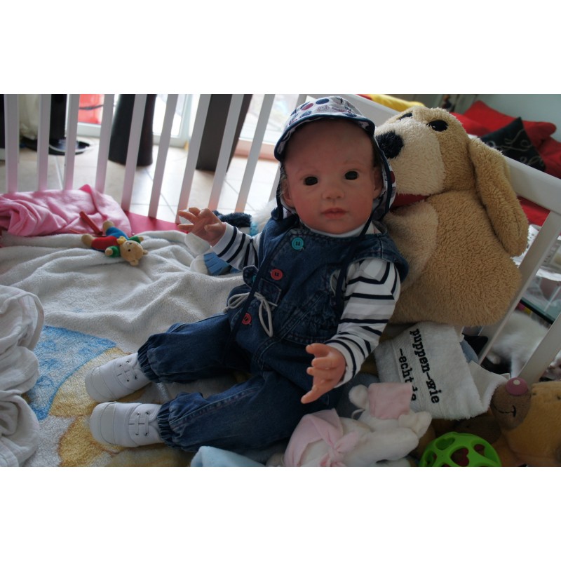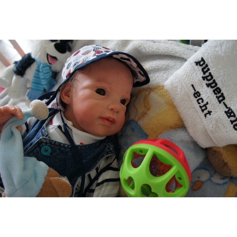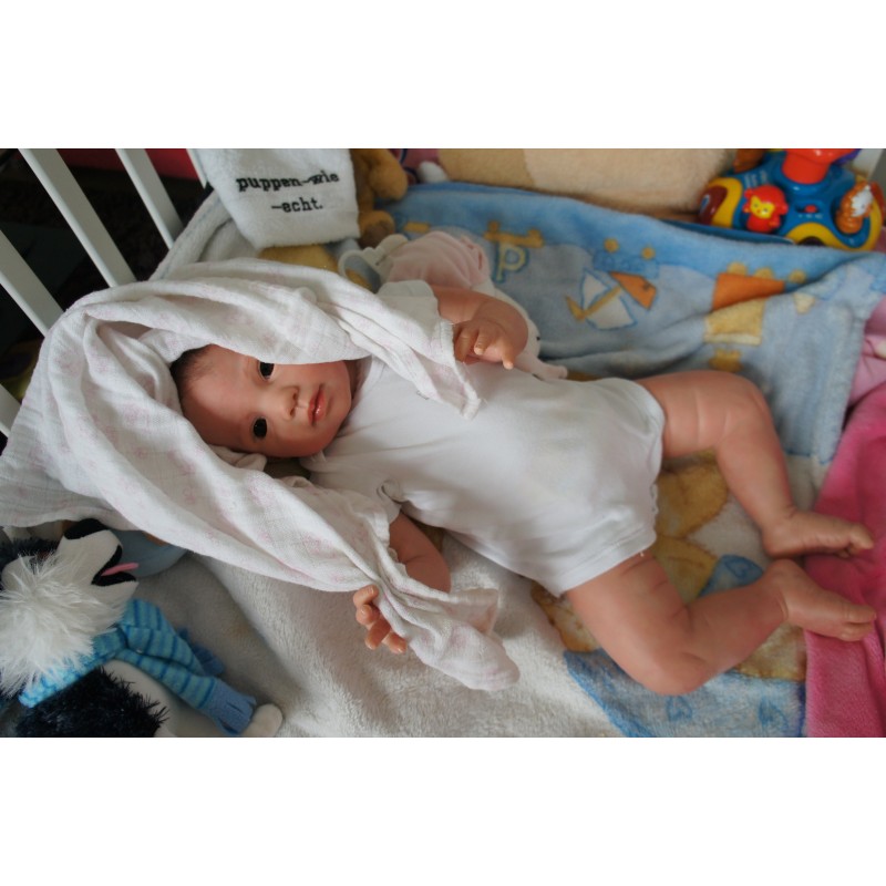 Ich wurde mit hochwertigen Farben in Real Effekt Technik eingefärbt. Mit Genesis Farben habe ich dieses alles noch mal zum Schluss gut versiegelt und eingebrannt. Diese wurde in mehreren Schichten aufgetragen, sodass ein sehr realistisches Hautbild entstanden ist. (Wisch- und Wasserfest kein Abblättern mgl). Feinste Schattierungen und leichte Betonung der Speckfalten wurden bei mir auch nicht vergessen. Leichte Äderchen an Händen, Armen, Füßchen, Beinen, Ohren, Kopf und Gesicht lassen mich wie ein echtes Baby aussehen. Jedes Fältchen an mir wurde einzeln betont. Zarte Augenbrauen wurden mir auch gegeben. Meine Nase wurde geöffnet und hinterlegt, sodass ich jetzt auch gut Luft bekomme. Auch zarte Befeuchtung der Augen, Mund und Nase lassen mich noch echter wirken.