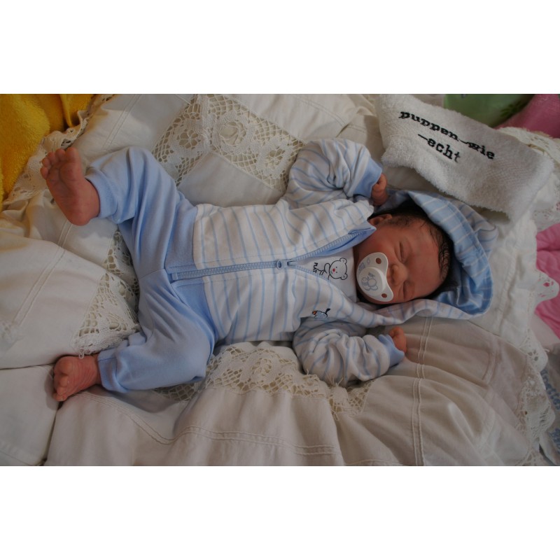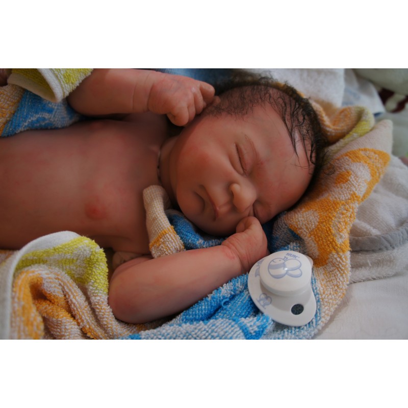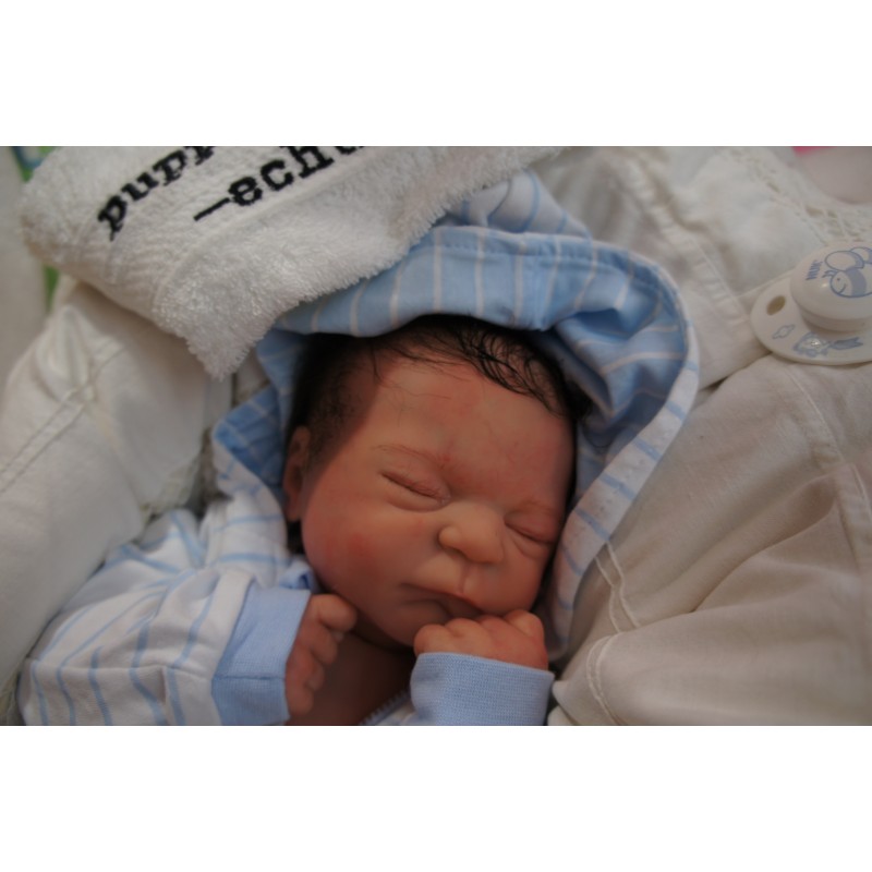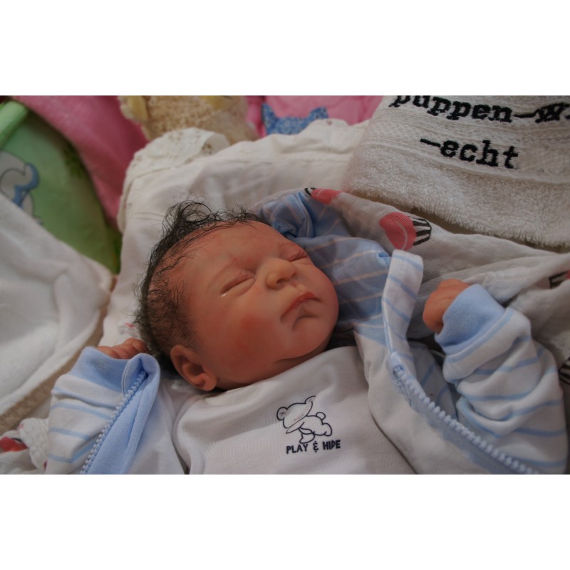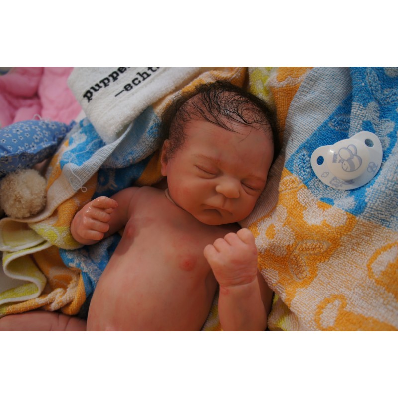 Ich wurde mit hochwertigen Farben in Real Effekt Technik eingefärbt. Mit Genesis Farben habe ich dieses alles noch mal zum Schluss gut versiegelt und eingebrannt. Diese wurde in mehreren Schichten aufgetragen, sodass ein sehr realistisches Hautbild entstanden ist. (Wisch- und Wasserfest kein Abblättern mgl). Feinste Schattierungen und leichte Betonung der Speckfalten wurden bei mir auch nicht vergessen. Leichte Äderchen an Händen, Armen, Füßchen, Beinen, Ohren, Kopf und Gesicht lassen mich wie ein echtes Baby aussehen. Jedes Fältchen an mir wurde einzeln betont. Zarte Augenbrauen wurden mir auch gegeben. Meine Nase wurde geöffnet und hinterlegt, sodass ich jetzt auch gut Luft bekomme. Auch zarte Befeuchtung der Augen, Mund und Nase lassen mich noch echter wirken.