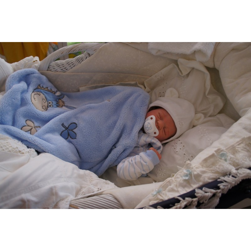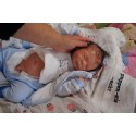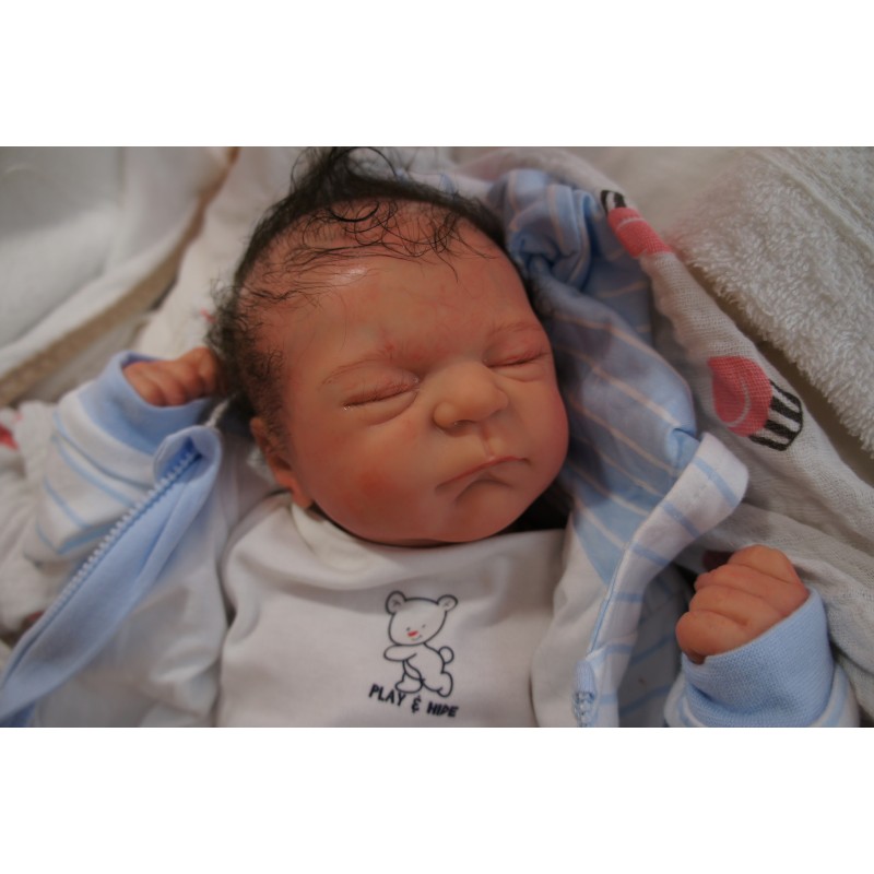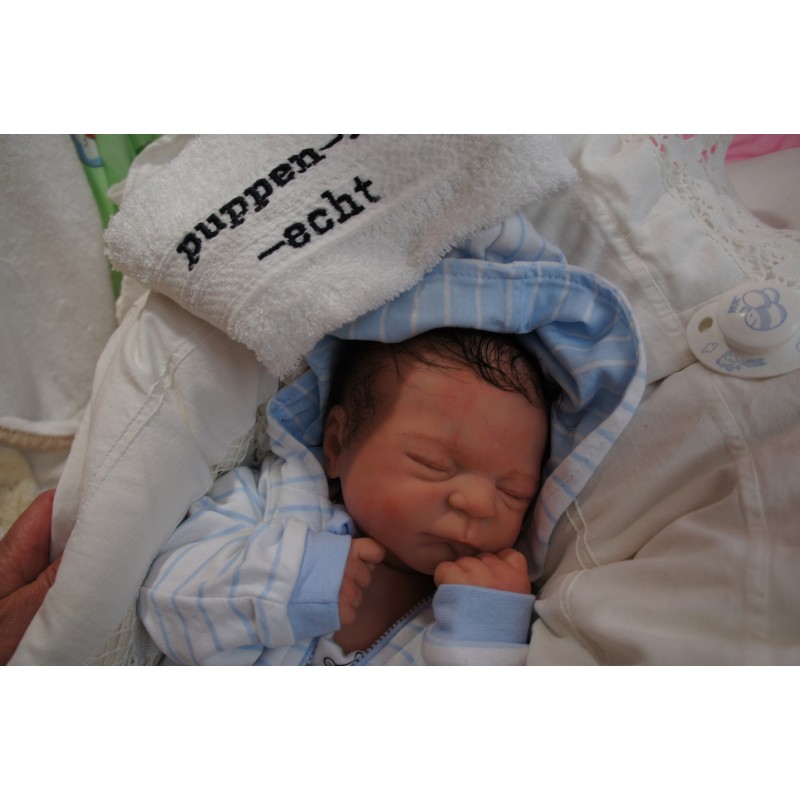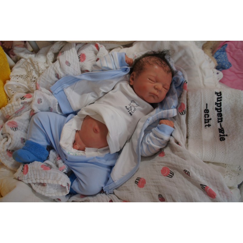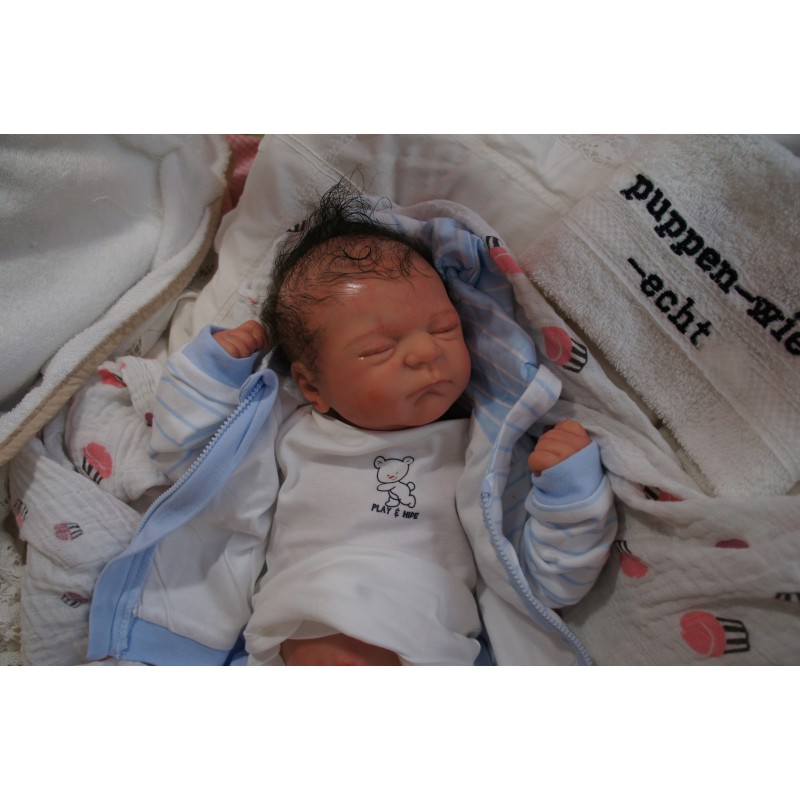 Ich wurde mit hochwertigen Farben in Real Effekt Technik eingefärbt. Mit Genesis Farben habe ich dieses alles noch mal zum Schluss gut versiegelt und eingebrannt. Diese wurde in mehreren Schichten aufgetragen, sodass ein sehr realistisches Hautbild entstanden ist. (Wisch- und Wasserfest kein Abblättern mgl). Feinste Schattierungen und leichte Betonung der Speckfalten wurden bei mir auch nicht vergessen. Leichte Äderchen an Händen, Armen, Füßchen, Beinen, Ohren, Kopf und Gesicht lassen mich wie ein echtes Baby aussehen. Jedes Fältchen an mir wurde einzeln betont. Zarte Augenbrauen wurden mir auch gegeben. Meine Nase wurde geöffnet und hinterlegt, sodass ich jetzt auch gut Luft bekomme. Auch zarte Befeuchtung der Augen, Mund und Nase lassen mich noch echter wirken.