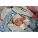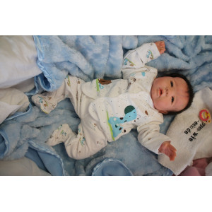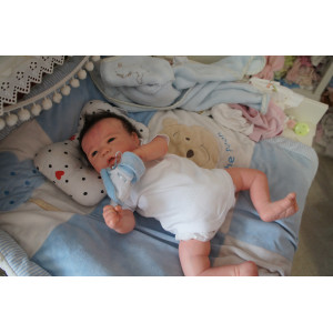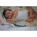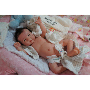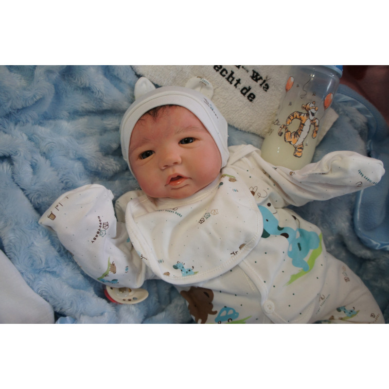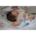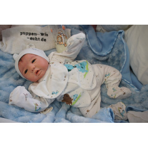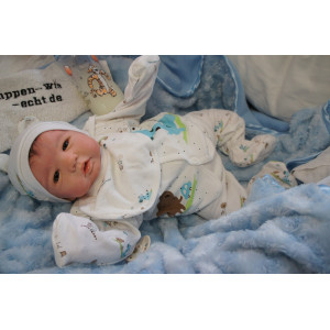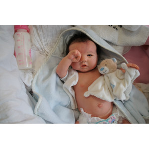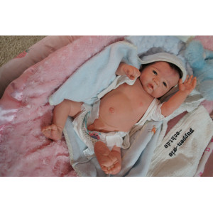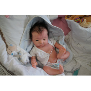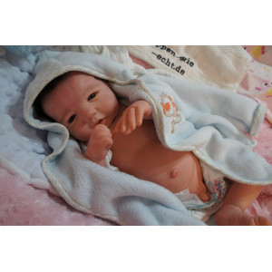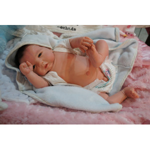 Ich wurde mit hochwertigen Farben in Real Effekt Technik eingefärbt. Mit Genesis Farben habe ich dieses alles noch mal zum Schluss gut versiegelt und eingebrannt. Diese wurde in mehreren Schichten aufgetragen, sodass ein sehr realistisches Hautbild entstanden ist. (Wisch- und Wasserfest kein Abblättern mgl). Feinste Schattierungen und leichte Betonung der Speckfalten wurden bei mir auch nicht vergessen. Leichte Äderchen an Händen, Armen, Füßchen, Beinen, Ohren, Kopf und Gesicht lassen mich wie ein echtes Baby aussehen. Jedes Fältchen an mir wurde einzeln betont. Zarte Augenbrauen wurden mir auch gegeben. Meine Nase wurde geöffnet und hinterlegt, sodass ich jetzt auch gut Luft bekomme. Auch zarte Befeuchtung der Augen, Mund und Nase lassen mich noch echter wirken.