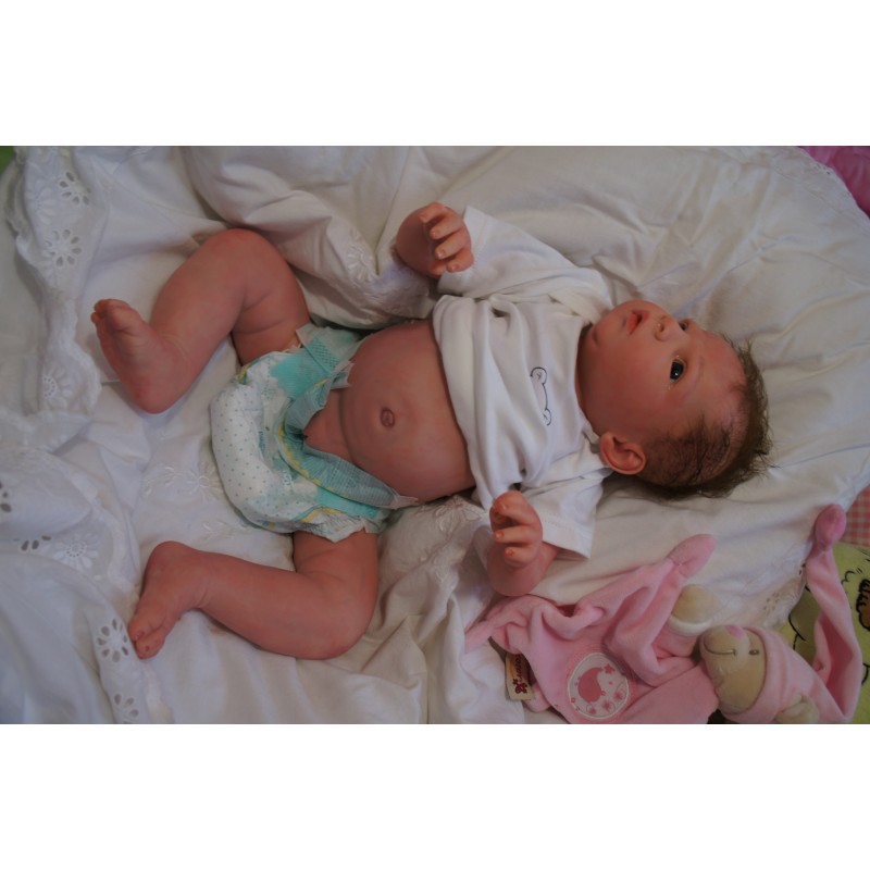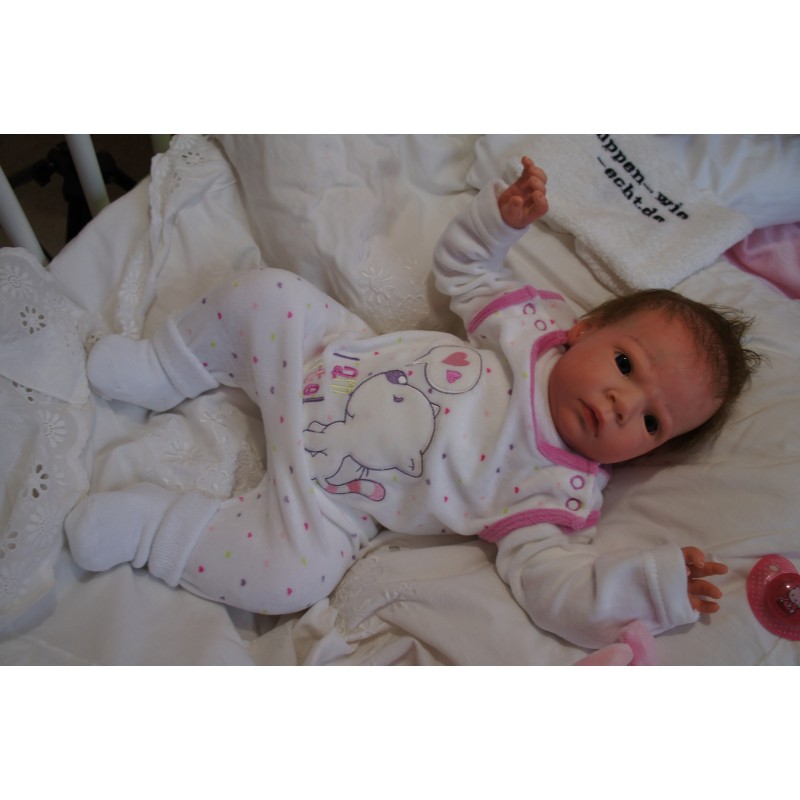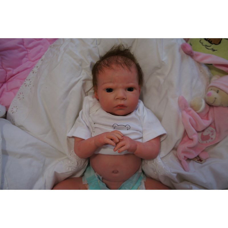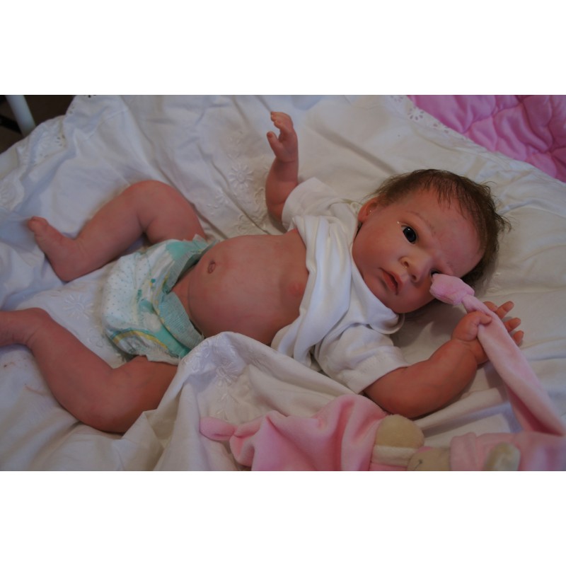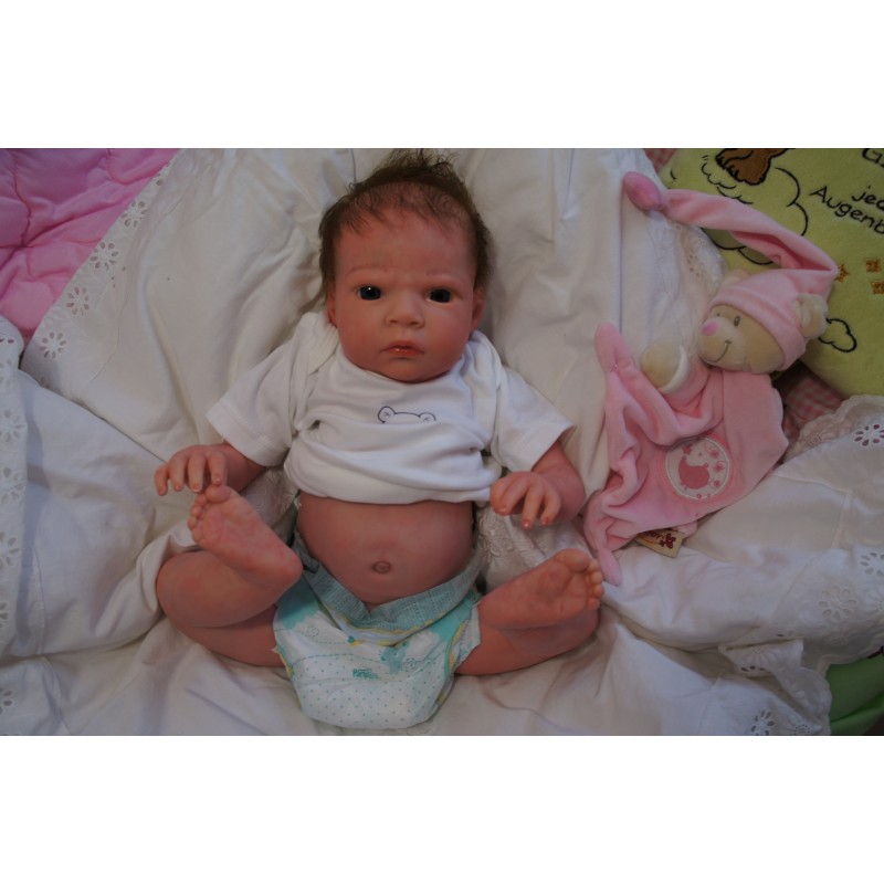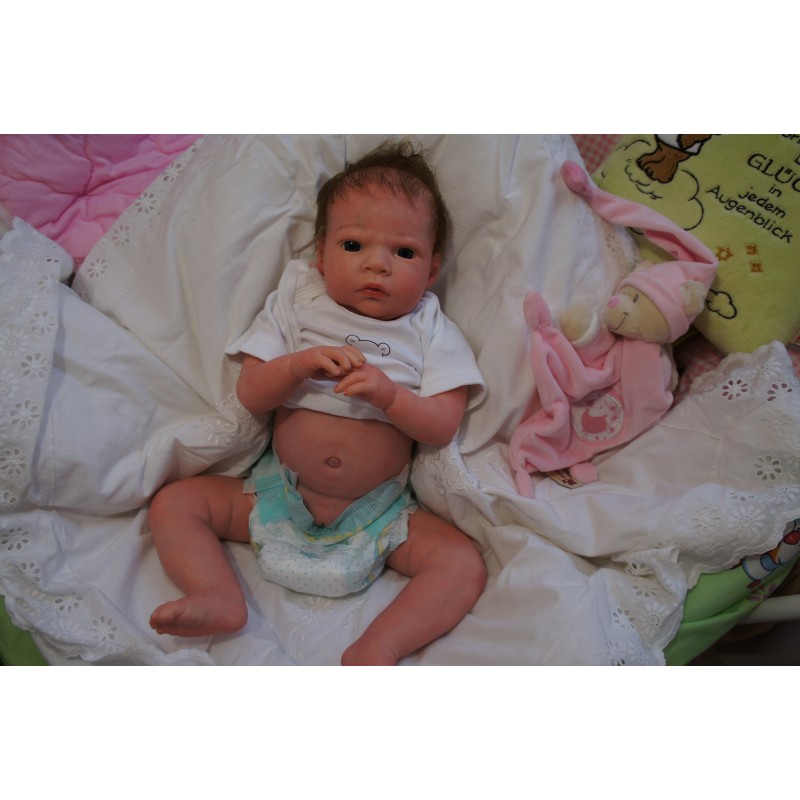Ich wurde mit hochwertigen Farben in Real Effekt Technik eingefärbt. Mit Genesis Farben habe ich dieses alles noch mal zum Schluss gut versiegelt und eingebrannt. Diese wurde in mehreren Schichten aufgetragen, sodass ein sehr realistisches Hautbild entstanden ist. (Wisch- und Wasserfest kein Abblättern mgl). Feinste Schattierungen und leichte Betonung der Speckfalten wurden bei mir auch nicht vergessen. Leichte Äderchen an Händen, Armen, Füßchen, Beinen, Ohren, Kopf und Gesicht lassen mich wie ein echtes Baby aussehen. Jedes Fältchen an mir wurde einzeln betont. Zarte Augenbrauen wurden mir auch gegeben. Meine Nase wurde geöffnet und hinterlegt, sodass ich jetzt auch gut Luft bekomme. Auch zarte Befeuchtung der Augen, Mund und Nase lassen mich noch echter wirken.