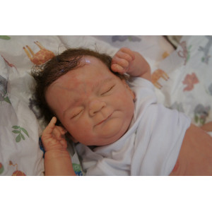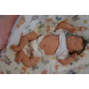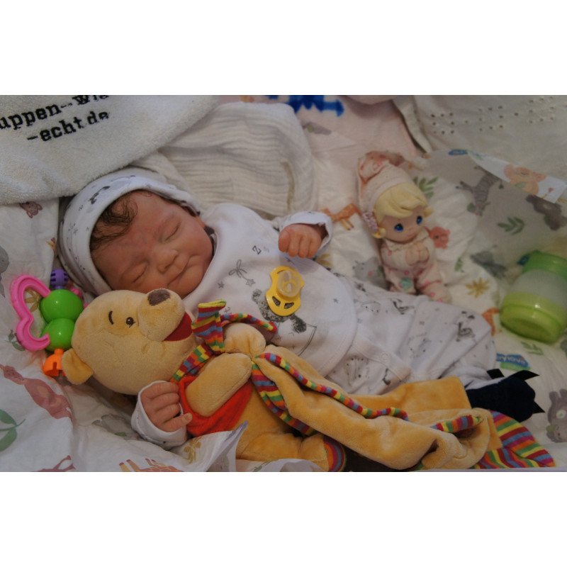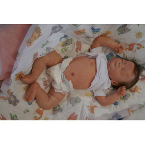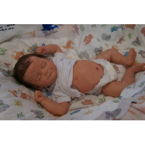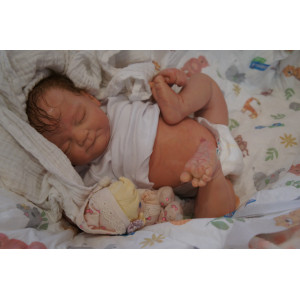 Ich wurde mit hochwertigen Farben in Real Effekt Technik eingefärbt. Mit Genesis Farben habe ich dieses alles noch mal zum Schluss gut versiegelt und eingebrannt. Diese wurde in mehreren Schichten aufgetragen, sodass ein sehr realistisches Hautbild entstanden ist. (Wisch- und Wasserfest kein Abblättern mgl). Feinste Schattierungen und leichte Betonung der Speckfalten wurden bei mir auch nicht vergessen. Leichte Äderchen an Händen, Armen, Füßchen, Beinen, Ohren, Kopf und Gesicht lassen mich wie ein echtes Baby aussehen. Jedes Fältchen an mir wurde einzeln betont. Zarte Augenbrauen wurden mir auch gegeben. Meine Nase wurde geöffnet und hinterlegt, sodass ich jetzt auch gut Luft bekomme. Auch zarte Befeuchtung der Augen, Mund und Nase lassen mich noch echter wirken.