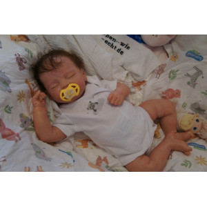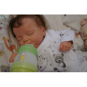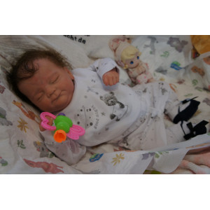 Meine Haare sind mittelbraun und im micro Rooting Verfahren einzeln eingepflanzt (Feinstes Mohair ). Anschließend natürlich von innen versiegelt. Und nun kann man meine Haare kämmen und auch mal leicht waschen. Die passenden Wimpern habe ich auch dazu gerootet bekommen, das sieht jetzt richtig echt aus. Meine Finger- und Fußnägel wurden fein Pedi- und Manikürt und anschließend dauerhaft versiegelt. Zum Schluss bekam ich noch einen Magnetschnuller. Und ein Duftöl aufgetragen, jetzt riech ich auch noch wie ein echtes Baby.