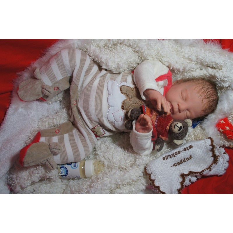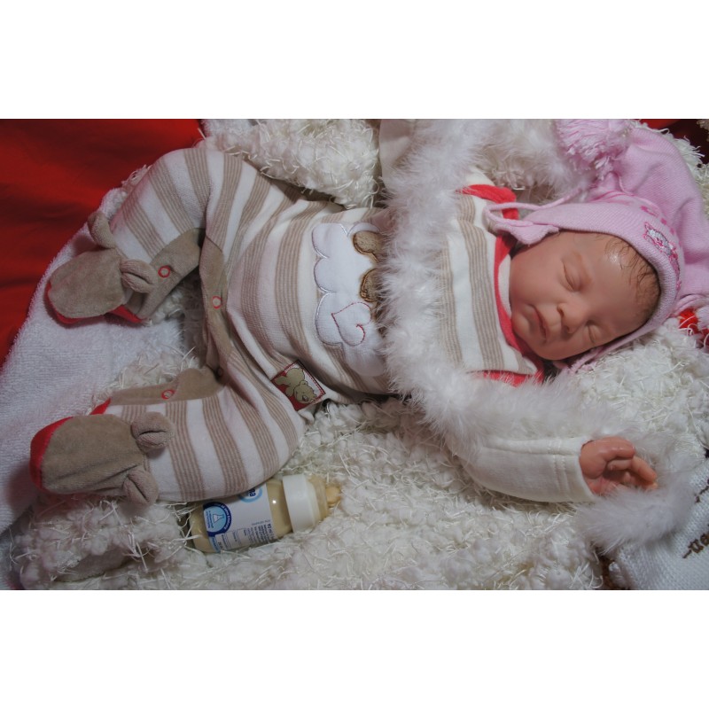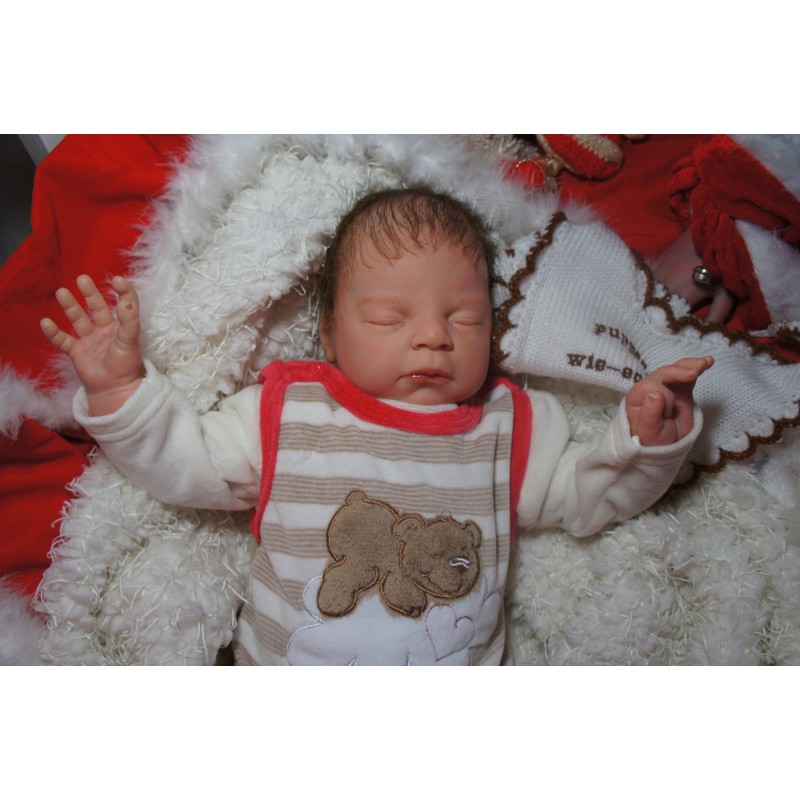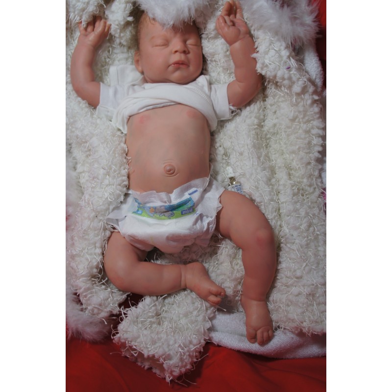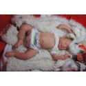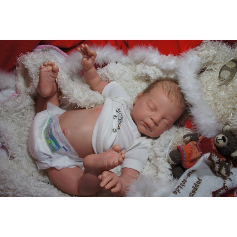 Ich wurde mit hochwertigen Farben in Real Effekt Technik eingefärbt. Mit Genesis Farben habe ich dieses alles noch mal zum Schluss gut versiegelt und eingebrannt. Diese wurde in mehreren Schichten aufgetragen, sodass ein sehr realistisches Hautbild entstanden ist. (Wisch- und Wasserfest kein Abblättern mgl). Feinste Schattierungen und leichte Betonung der Speckfalten wurden bei mir auch nicht vergessen. Leichte Äderchen an Händen, Armen, Füßchen, Beinen, Ohren, Kopf und Gesicht lassen mich wie ein echtes Baby aussehen. Jedes Fältchen an mir wurde einzeln betont. Zarte Augenbrauen wurden mir auch gegeben. Meine Nase wurde geöffnet und hinterlegt, sodass ich jetzt auch gut Luft bekomme. Auch zarte Befeuchtung der Augen, Mund und Nase lassen mich noch echter wirken.