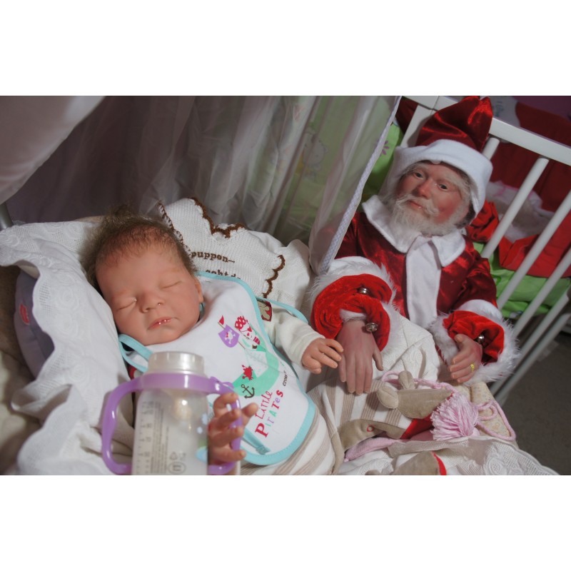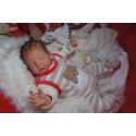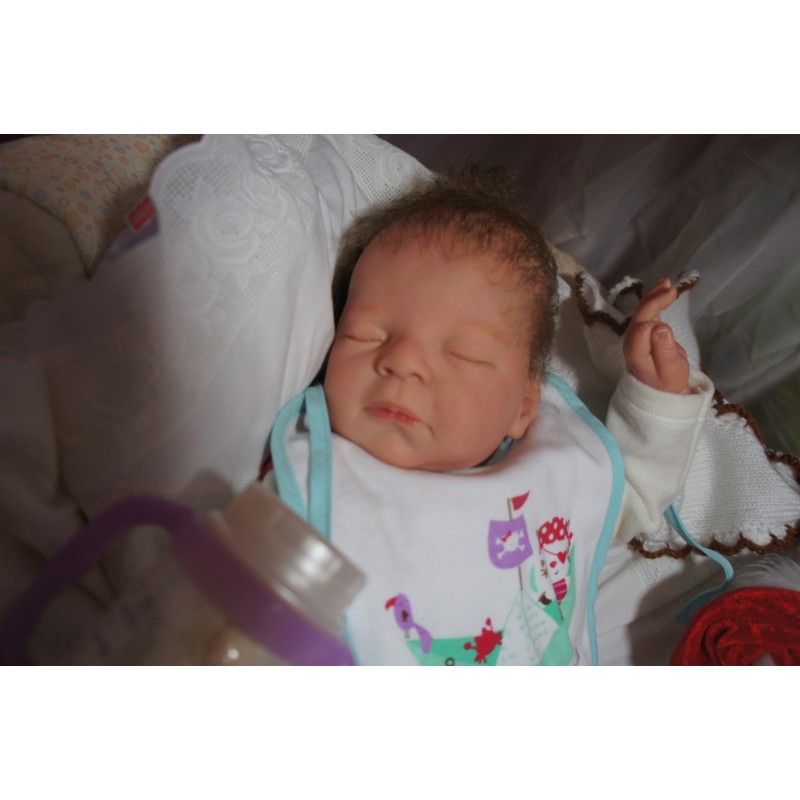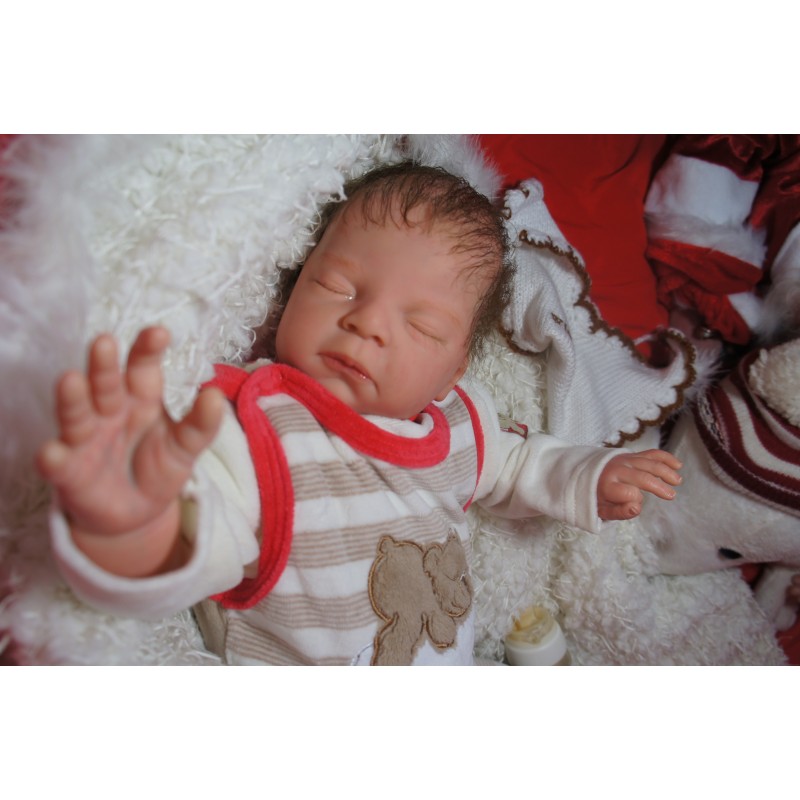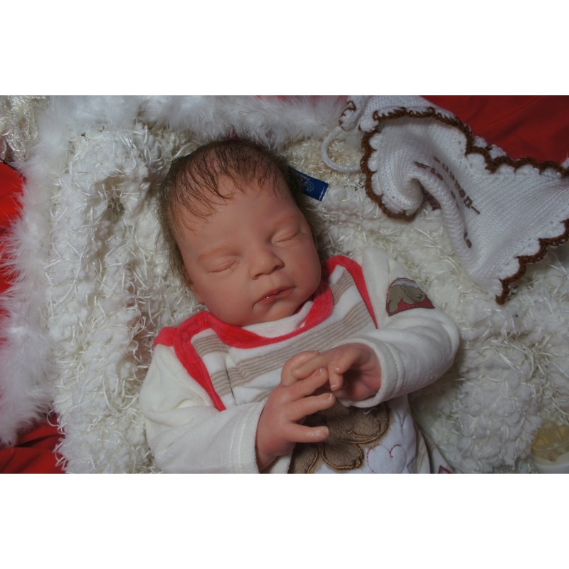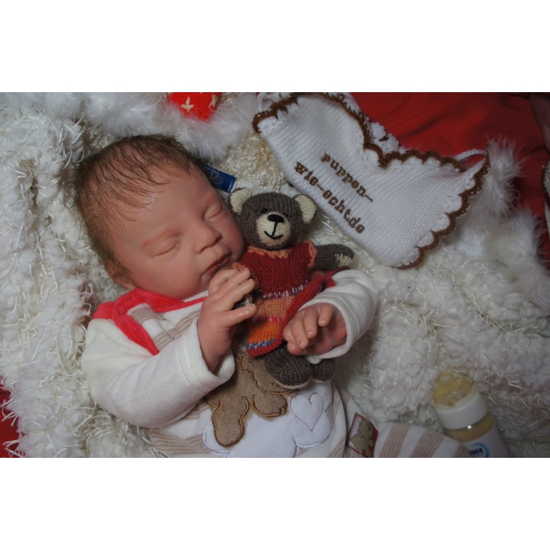 Ich wurde mit hochwertigen Farben in Real Effekt Technik eingefärbt. Mit Genesis Farben habe ich dieses alles noch mal zum Schluss gut versiegelt und eingebrannt. Diese wurde in mehreren Schichten aufgetragen, sodass ein sehr realistisches Hautbild entstanden ist. (Wisch- und Wasserfest kein Abblättern mgl). Feinste Schattierungen und leichte Betonung der Speckfalten wurden bei mir auch nicht vergessen. Leichte Äderchen an Händen, Armen, Füßchen, Beinen, Ohren, Kopf und Gesicht lassen mich wie ein echtes Baby aussehen. Jedes Fältchen an mir wurde einzeln betont. Zarte Augenbrauen wurden mir auch gegeben. Meine Nase wurde geöffnet und hinterlegt, sodass ich jetzt auch gut Luft bekomme. Auch zarte Befeuchtung der Augen, Mund und Nase lassen mich noch echter wirken.
