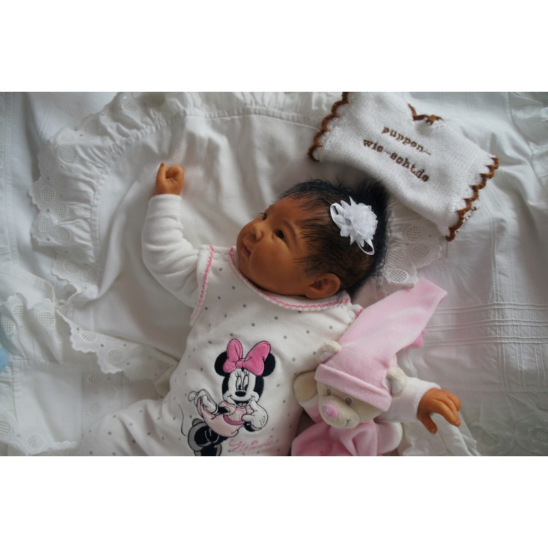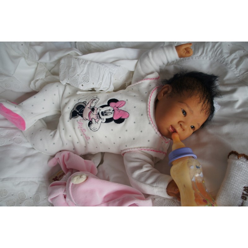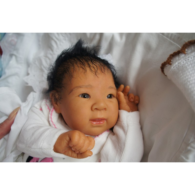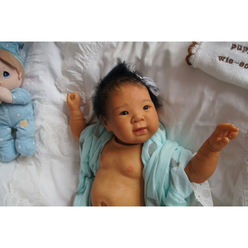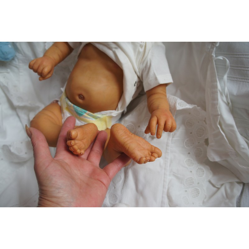 Ich wurde mit hochwertigen Farben in Real Effekt Technik eingefärbt. Mit Genesis Farben habe ich dieses alles noch mal zum Schluss gut versiegelt und eingebrannt. Diese wurde in mehreren Schichten aufgetragen, sodass ein sehr realistisches Hautbild entstanden ist. (Wisch- und Wasserfest kein Abblättern mgl). Feinste Schattierungen und leichte Betonung der Speckfalten wurden bei mir auch nicht vergessen. Leichte Äderchen an Händen, Armen, Füßchen, Beinen, Ohren, Kopf und Gesicht lassen mich wie ein echtes Baby aussehen. Jedes Fältchen an mir wurde einzeln betont. Zarte Augenbrauen wurden mir auch gegeben. Meine Nase wurde geöffnet und hinterlegt, sodass ich jetzt auch gut Luft bekomme. Auch zarte Befeuchtung der Augen, Mund und Nase lassen mich noch echter wirken.