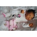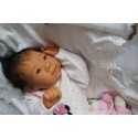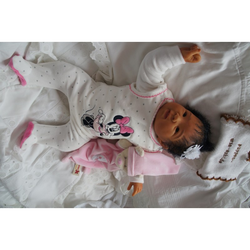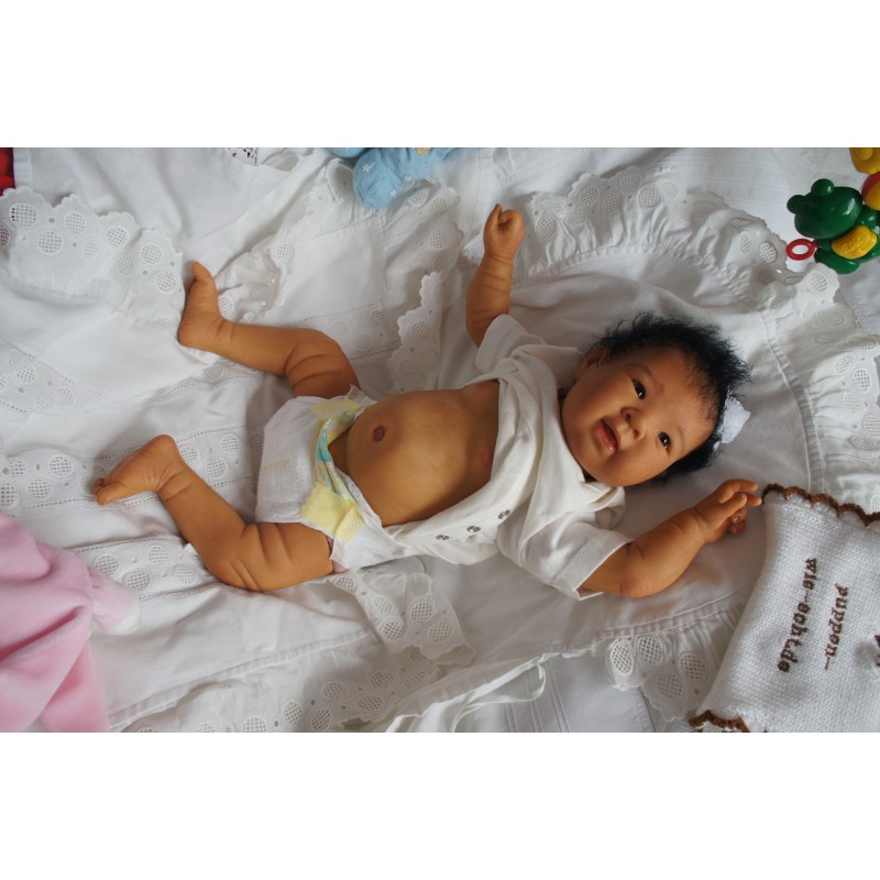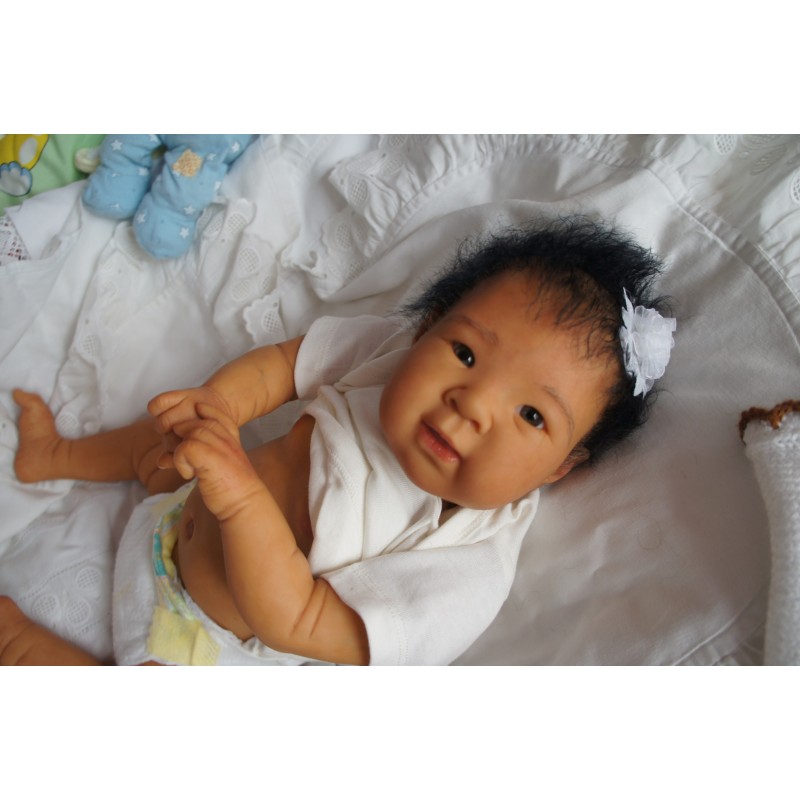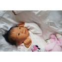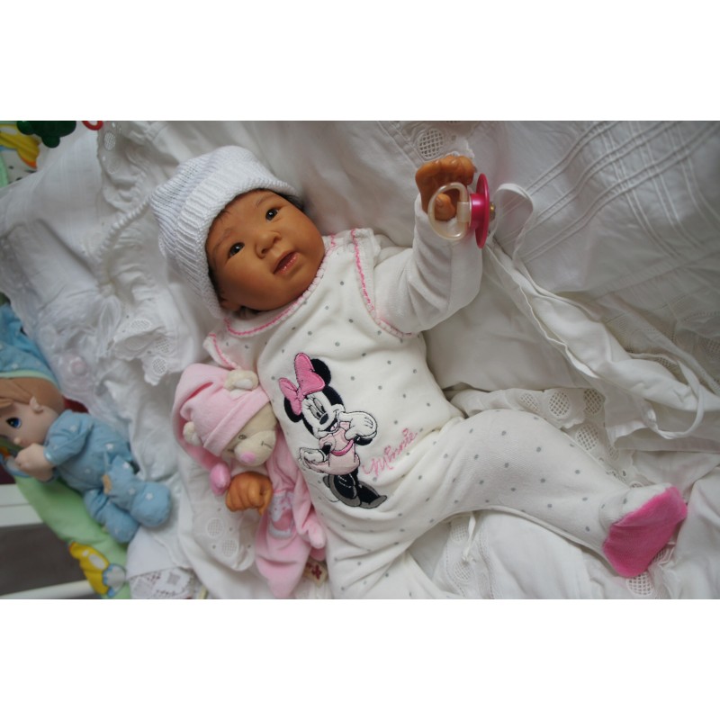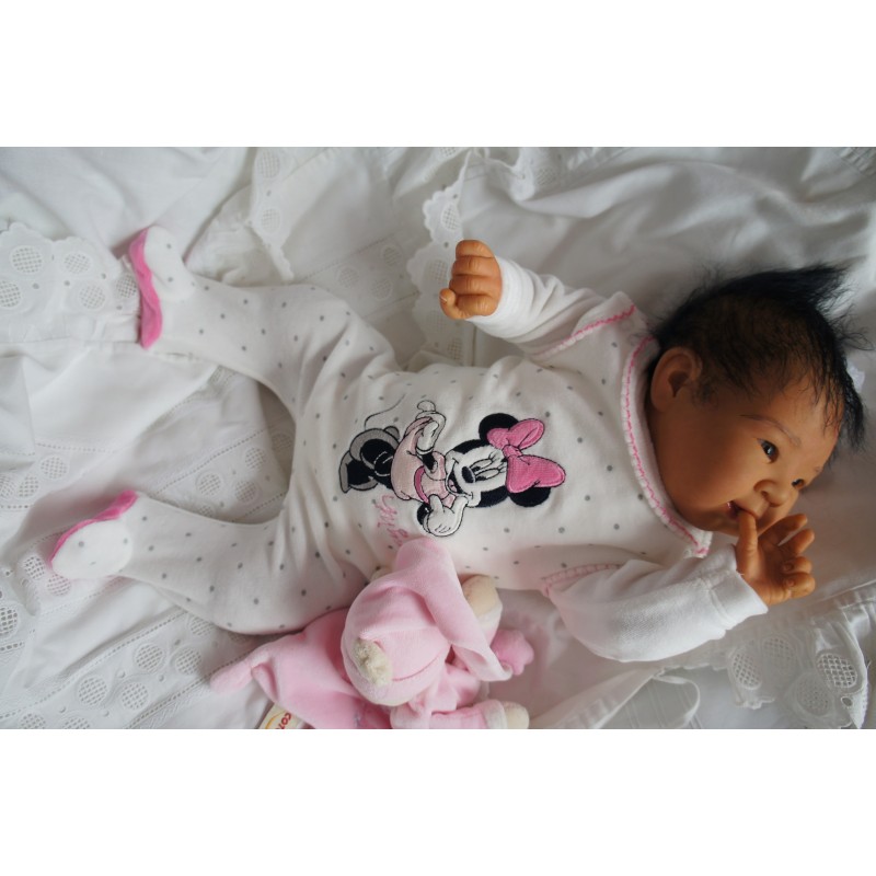 Ich wurde mit hochwertigen Farben in Real Effekt Technik eingefärbt. Mit Genesis Farben habe ich dieses alles noch mal zum Schluss gut versiegelt und eingebrannt. Diese wurde in mehreren Schichten aufgetragen, sodass ein sehr realistisches Hautbild entstanden ist. (Wisch- und Wasserfest kein Abblättern mgl). Feinste Schattierungen und leichte Betonung der Speckfalten wurden bei mir auch nicht vergessen. Leichte Äderchen an Händen, Armen, Füßchen, Beinen, Ohren, Kopf und Gesicht lassen mich wie ein echtes Baby aussehen. Jedes Fältchen an mir wurde einzeln betont. Zarte Augenbrauen wurden mir auch gegeben. Meine Nase wurde geöffnet und hinterlegt, sodass ich jetzt auch gut Luft bekomme. Auch zarte Befeuchtung der Augen, Mund und Nase lassen mich noch echter wirken.