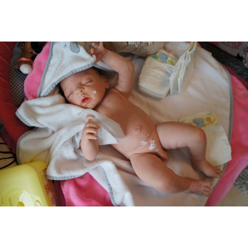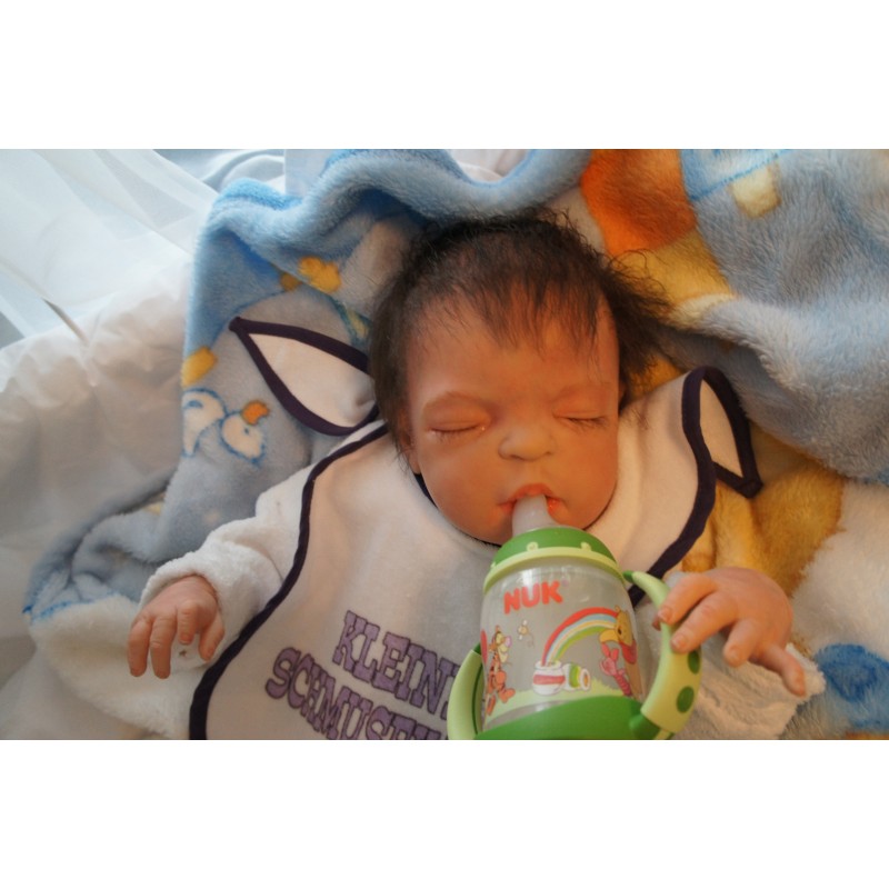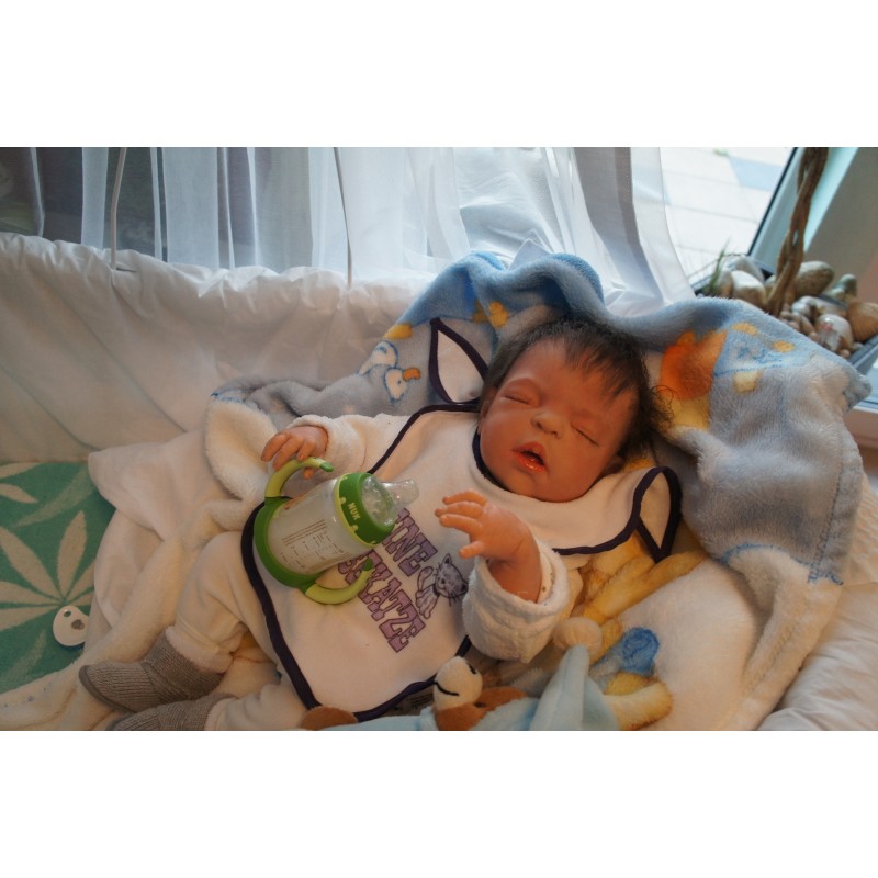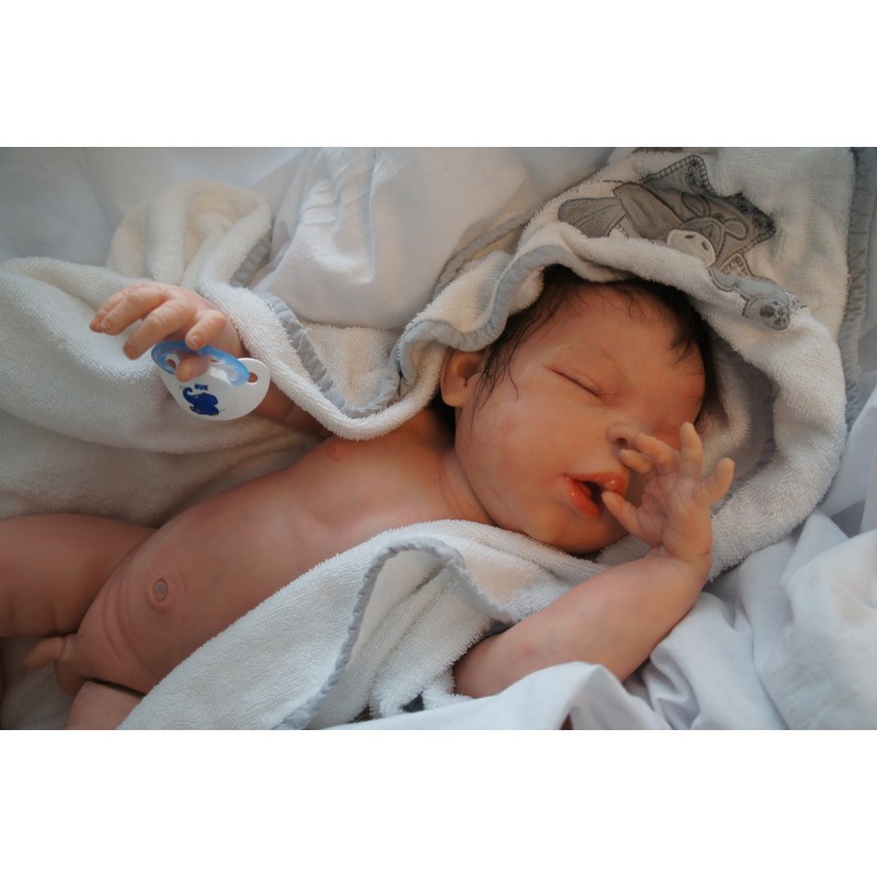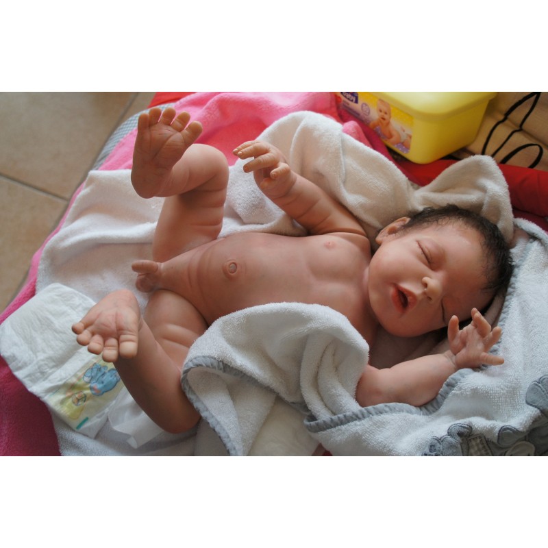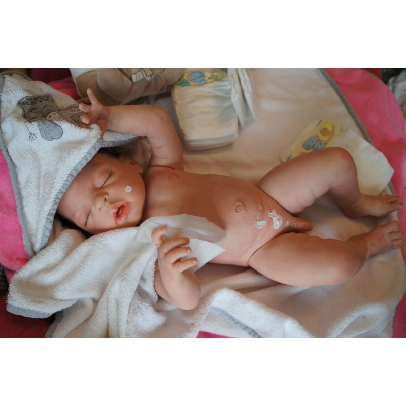 Ich wurde mit hochwertigen Farben in Real Effekt Technik eingefärbt. Mit Genesis Farben habe ich dieses alles noch mal zum Schluss gut versiegelt und eingebrannt. Diese wurde in mehreren Schichten aufgetragen, sodass ein sehr realistisches Hautbild entstanden ist. (Wisch- und Wasserfest kein Abblättern mgl). Feinste Schattierungen und leichte Betonung der Speckfalten wurden bei mir auch nicht vergessen. Leichte Äderchen an Händen, Armen, Füßchen, Beinen, Ohren, Kopf und Gesicht lassen mich wie ein echtes Baby aussehen. Jedes Fältchen an mir wurde einzeln betont. Zarte Augenbrauen wurden mir auch gegeben. Meine Nase wurde geöffnet und hinterlegt, sodass ich jetzt auch gut Luft bekomme. Auch zarte Befeuchtung der Augen, Mund und Nase lassen mich noch echter wirken.