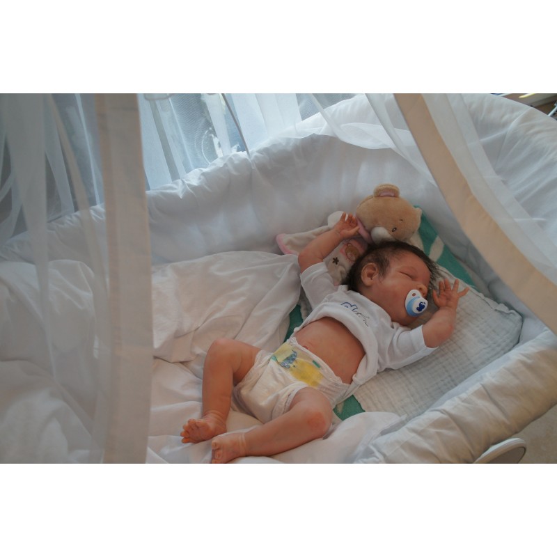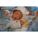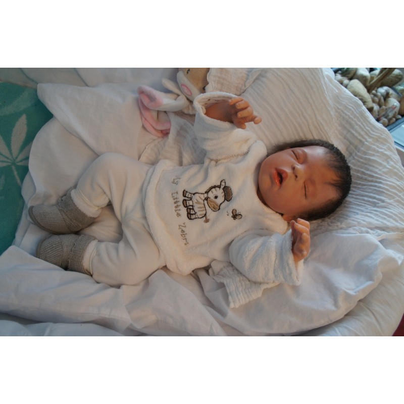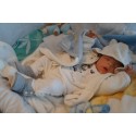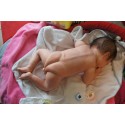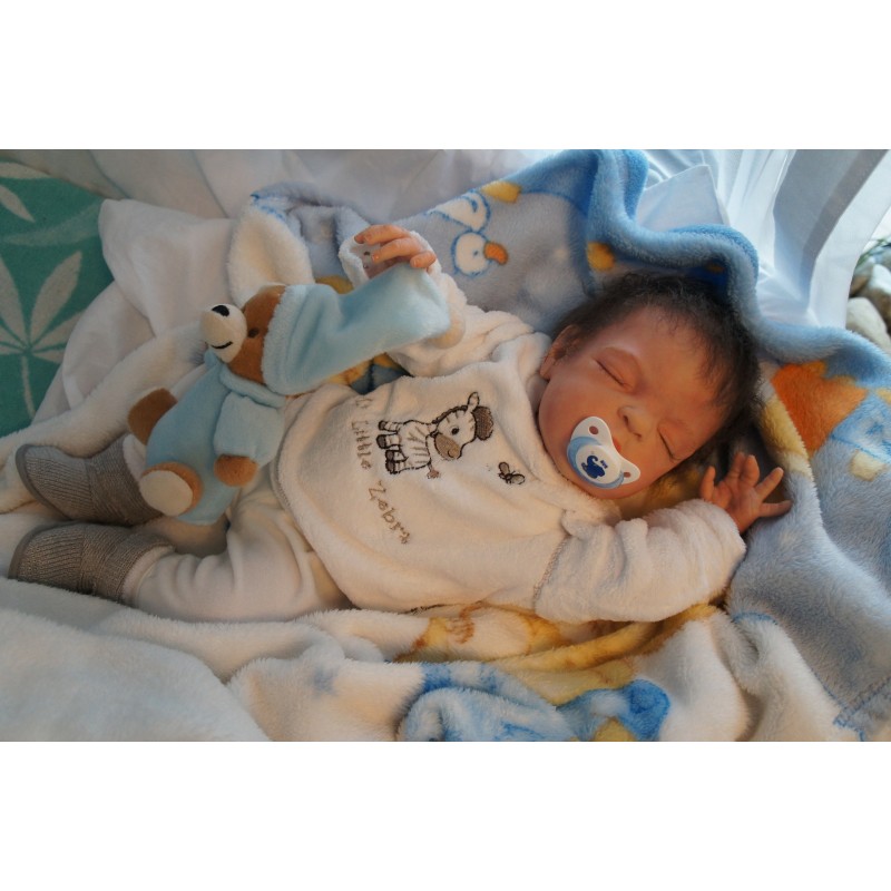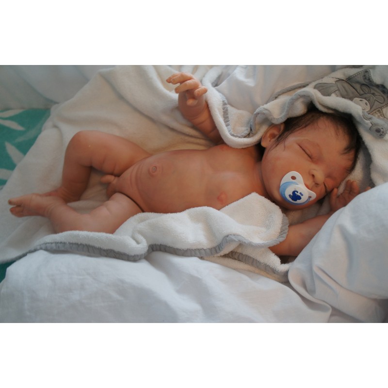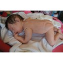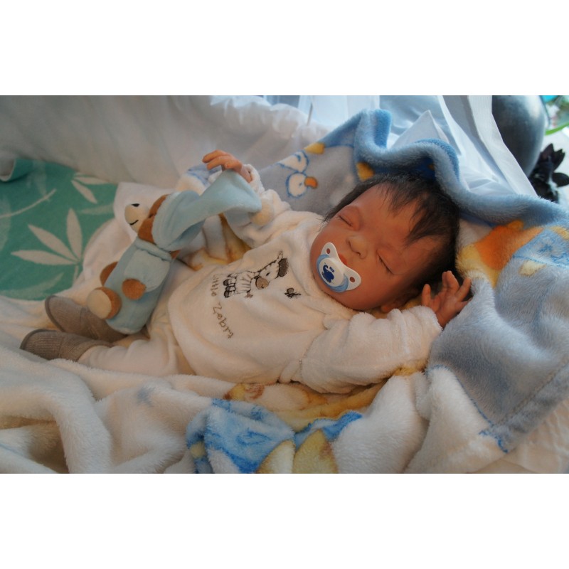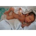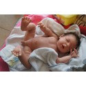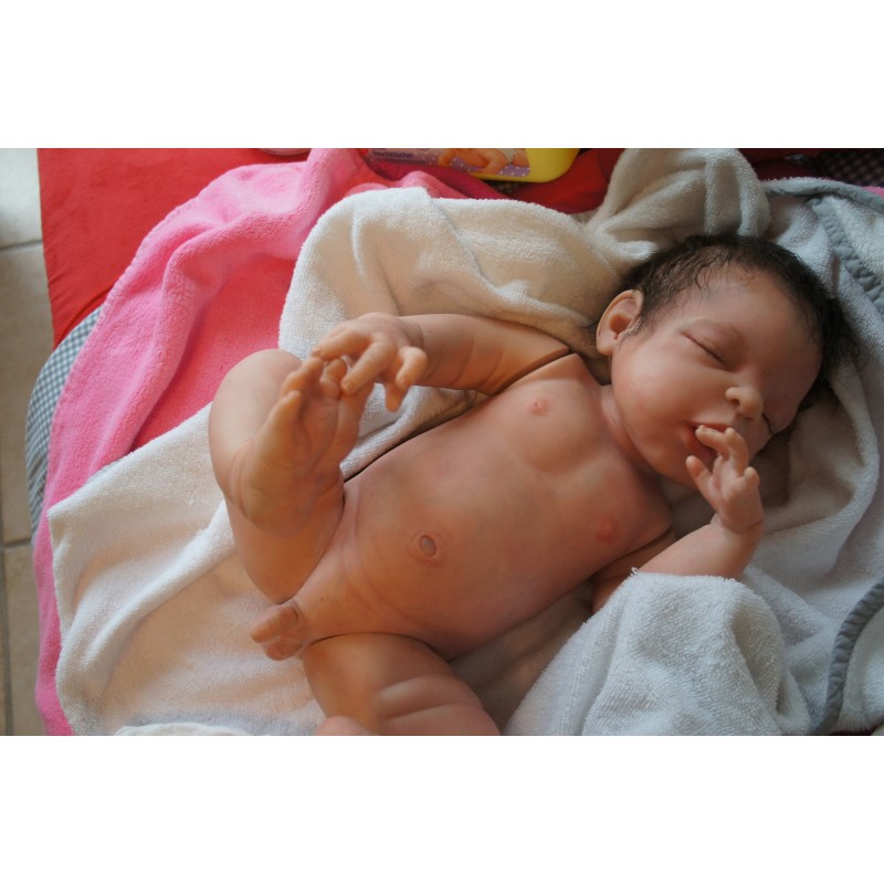 Ich wurde mit hochwertigen Farben in Real Effekt Technik eingefärbt. Mit Genesis Farben habe ich dieses alles noch mal zum Schluss gut versiegelt und eingebrannt. Diese wurde in mehreren Schichten aufgetragen, sodass ein sehr realistisches Hautbild entstanden ist. (Wisch- und Wasserfest kein Abblättern mgl). Feinste Schattierungen und leichte Betonung der Speckfalten wurden bei mir auch nicht vergessen. Leichte Äderchen an Händen, Armen, Füßchen, Beinen, Ohren, Kopf und Gesicht lassen mich wie ein echtes Baby aussehen. Jedes Fältchen an mir wurde einzeln betont. Zarte Augenbrauen wurden mir auch gegeben. Meine Nase wurde geöffnet und hinterlegt, sodass ich jetzt auch gut Luft bekomme. Auch zarte Befeuchtung der Augen, Mund und Nase lassen mich noch echter wirken.