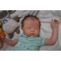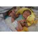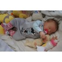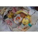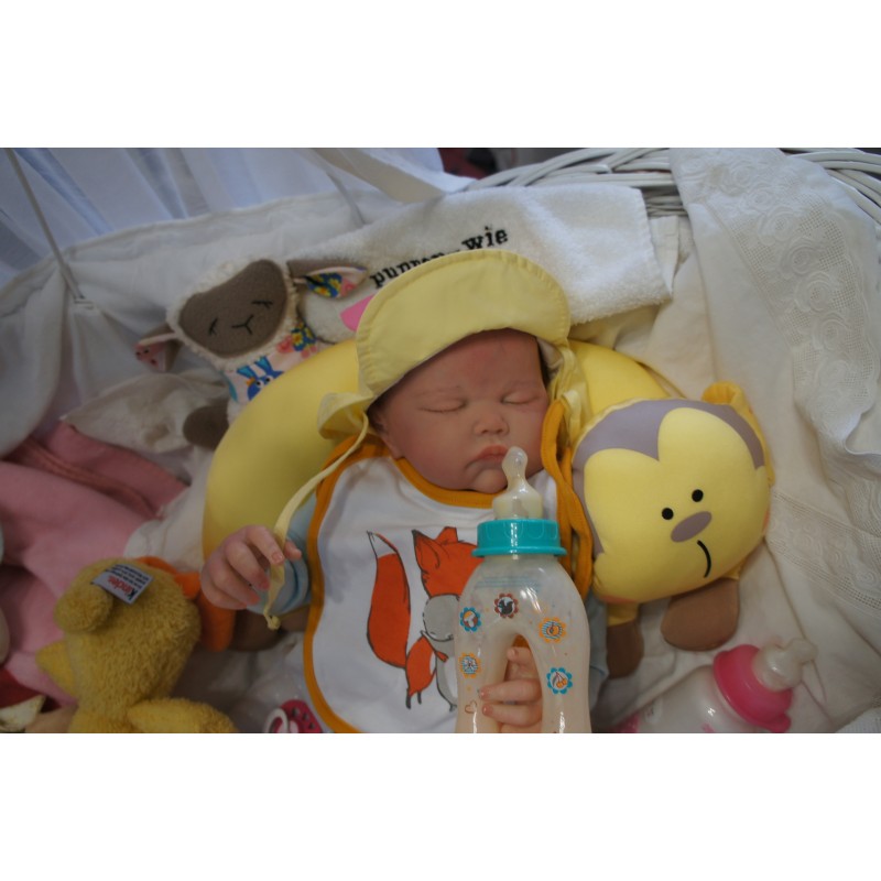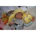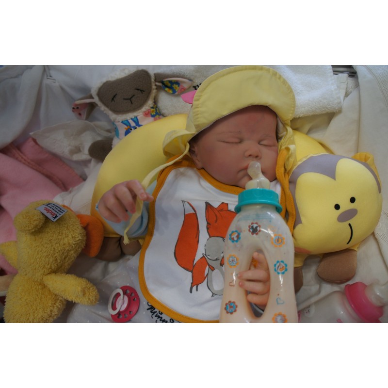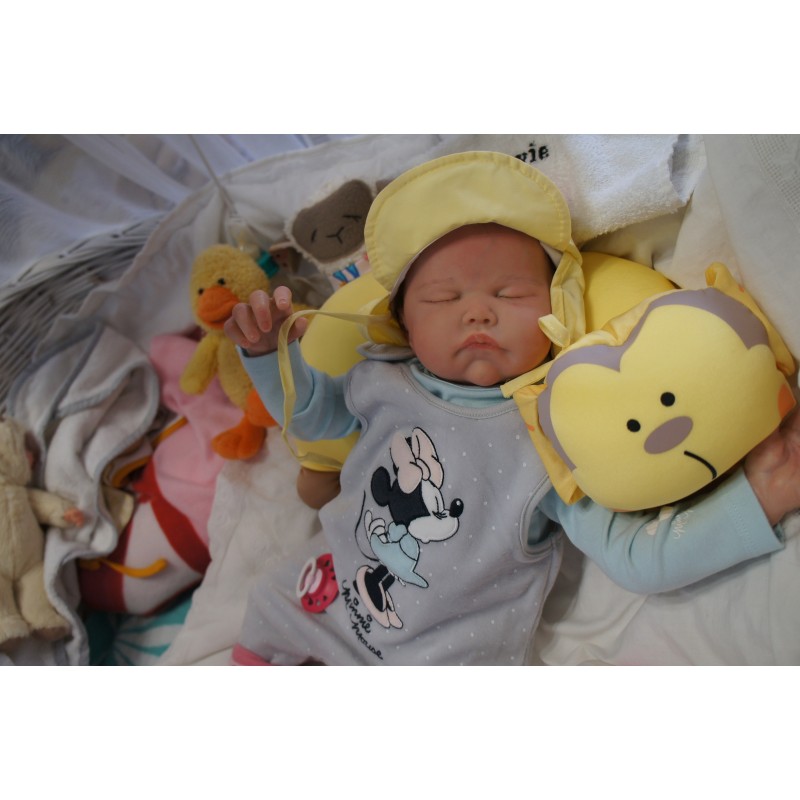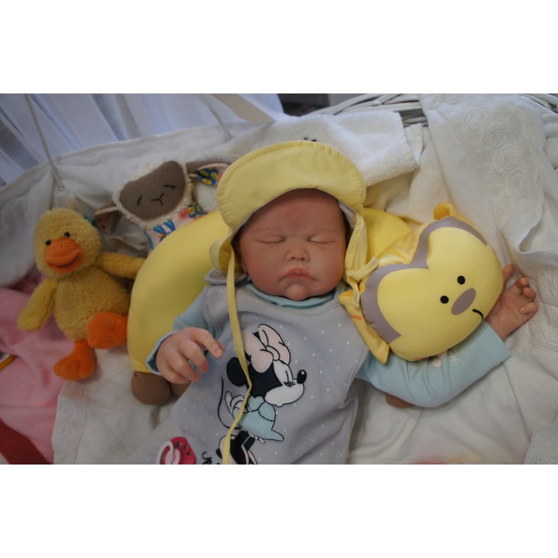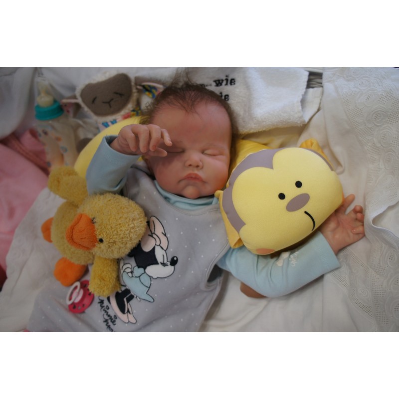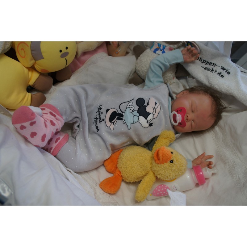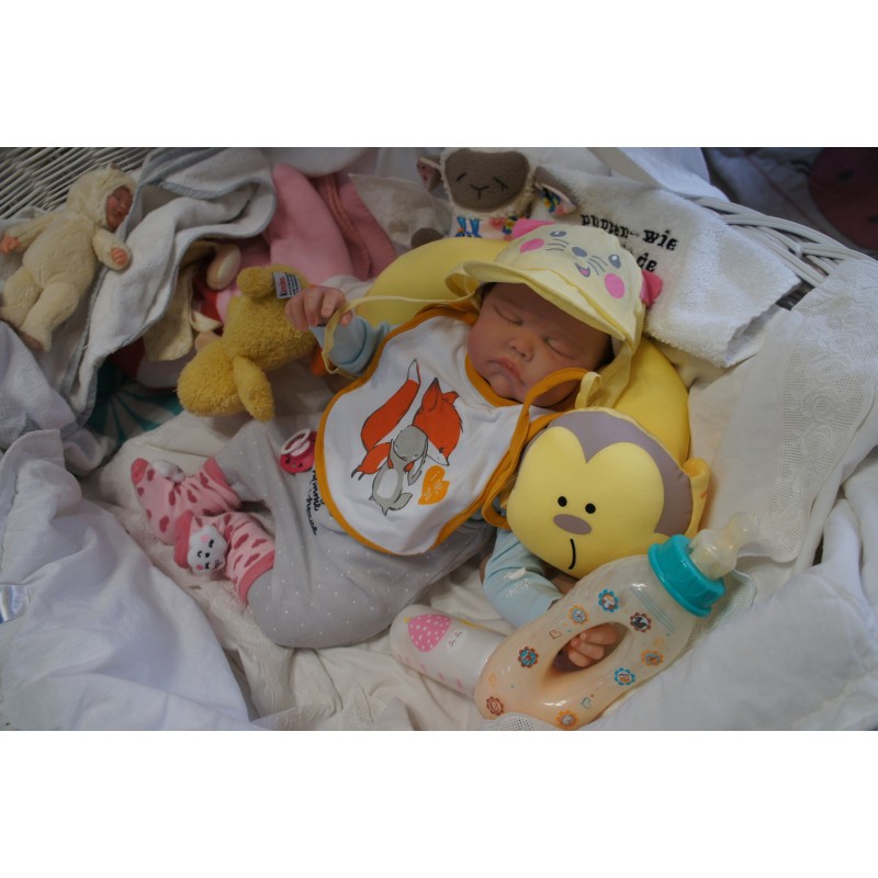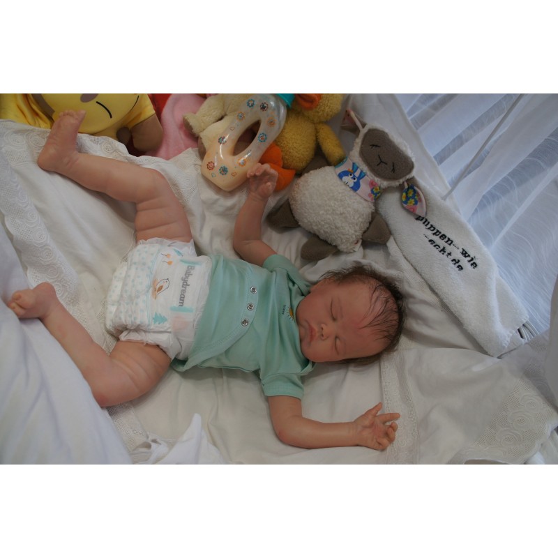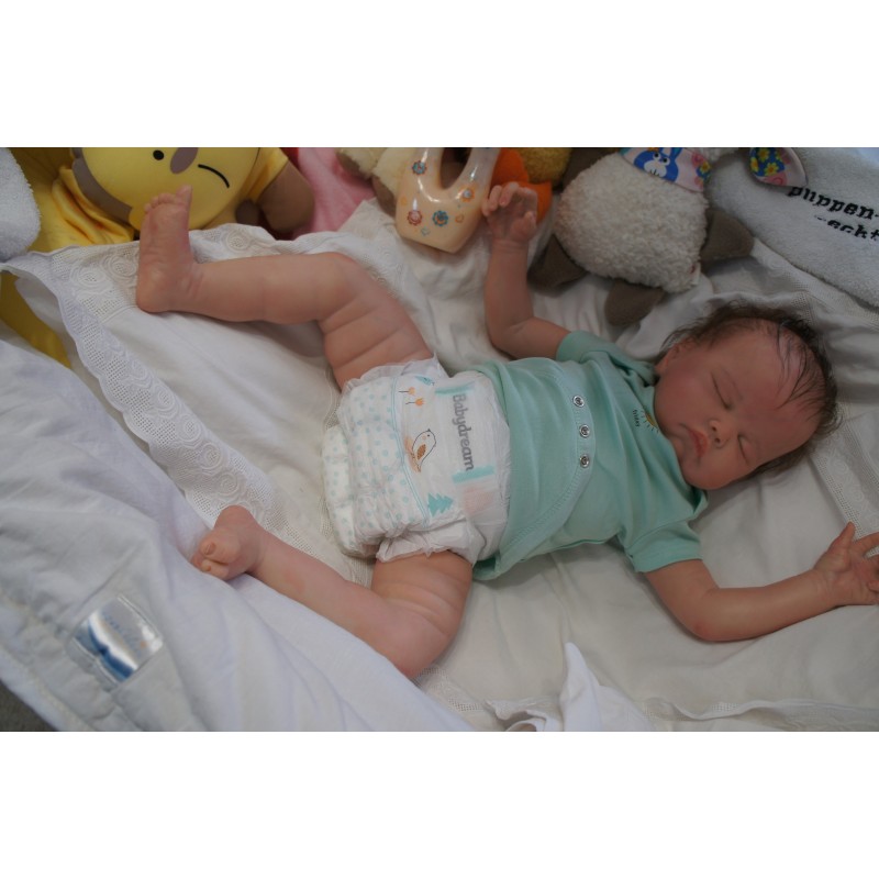 Ich wurde mit hochwertigen Farben in Real Effekt Technik eingefärbt. Mit Genesis Farben habe ich dieses alles noch mal zum Schluss gut versiegelt und eingebrannt. Diese wurde in mehreren Schichten aufgetragen, sodass ein sehr realistisches Hautbild entstanden ist. (Wisch- und Wasserfest kein Abblättern mgl). Feinste Schattierungen und leichte Betonung der Speckfalten wurden bei mir auch nicht vergessen. Leichte Äderchen an Händen, Armen, Füßchen, Beinen, Ohren, Kopf und Gesicht lassen mich wie ein echtes Baby aussehen. Jedes Fältchen an mir wurde einzeln betont. Zarte Augenbrauen wurden mir auch gegeben. Meine Nase wurde geöffnet und hinterlegt, sodass ich jetzt auch gut Luft bekomme. Auch zarte Befeuchtung der Augen, Mund und Nase lassen mich noch echter wirken.