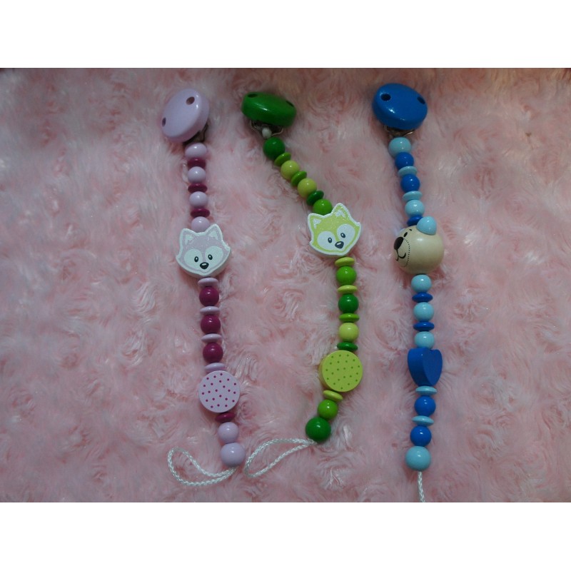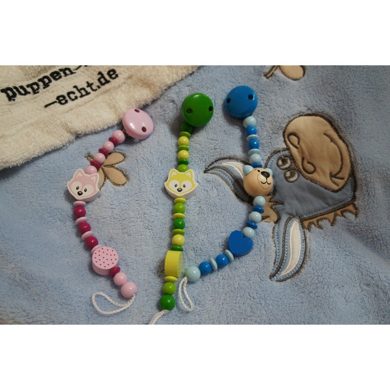- Eine handgemachte Schnulerkette in Rosa, Blau oder Grün
